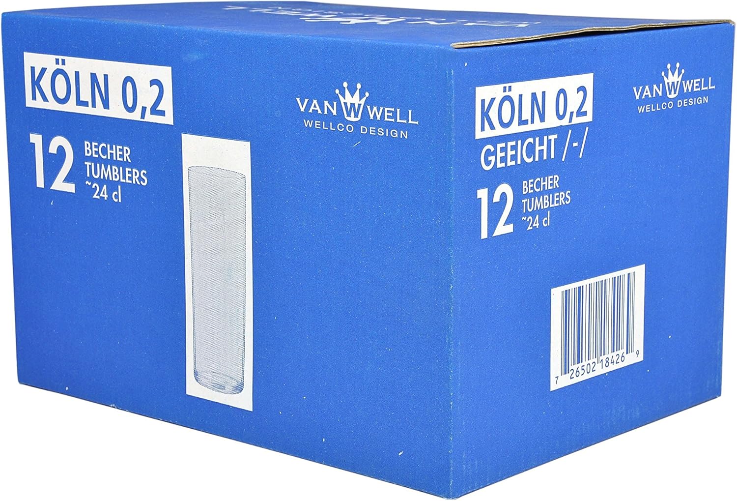 Чаши Van Well Kölsch, класически чаши за бира с линия за пълнене, 12 броя. 12 чаши Kölsch, класиката от всяка кьолнска кръчма. "Drink doch ene met'" - Независимо дали се поклащате в ритъма на музиката на частно парти или по време на карнавала в Кьолн: Традиционната чаша Kölsch за всеки социален повод. Gerh. van Well GmbH, Industriestr. 1, 47918 Tönisvorst. 12 висококачествени чаши Kölsch с ресторантско качество, оригинална кутия Van Well за удобно съхранение. Линия за пълнене/калибриране 0,2 л - вместимост 0,24 л - диаметър приблизително 5,3 см - височина 15,0 см