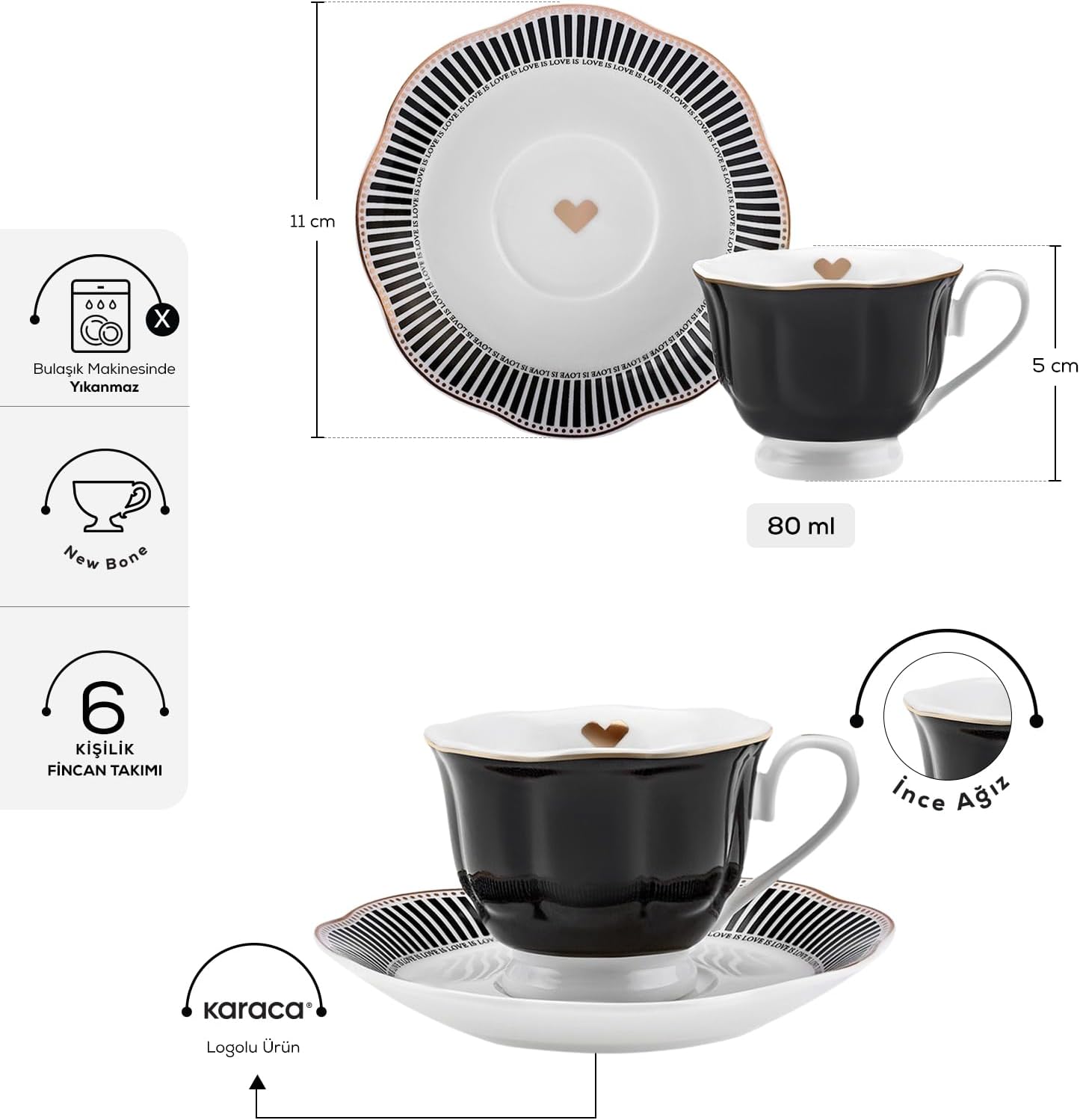Комплект чаши за еспресо кафе KARACA Piraye, порцелан, за 6 души, 80 мл, черно и бяло, многоцветен, 12 части