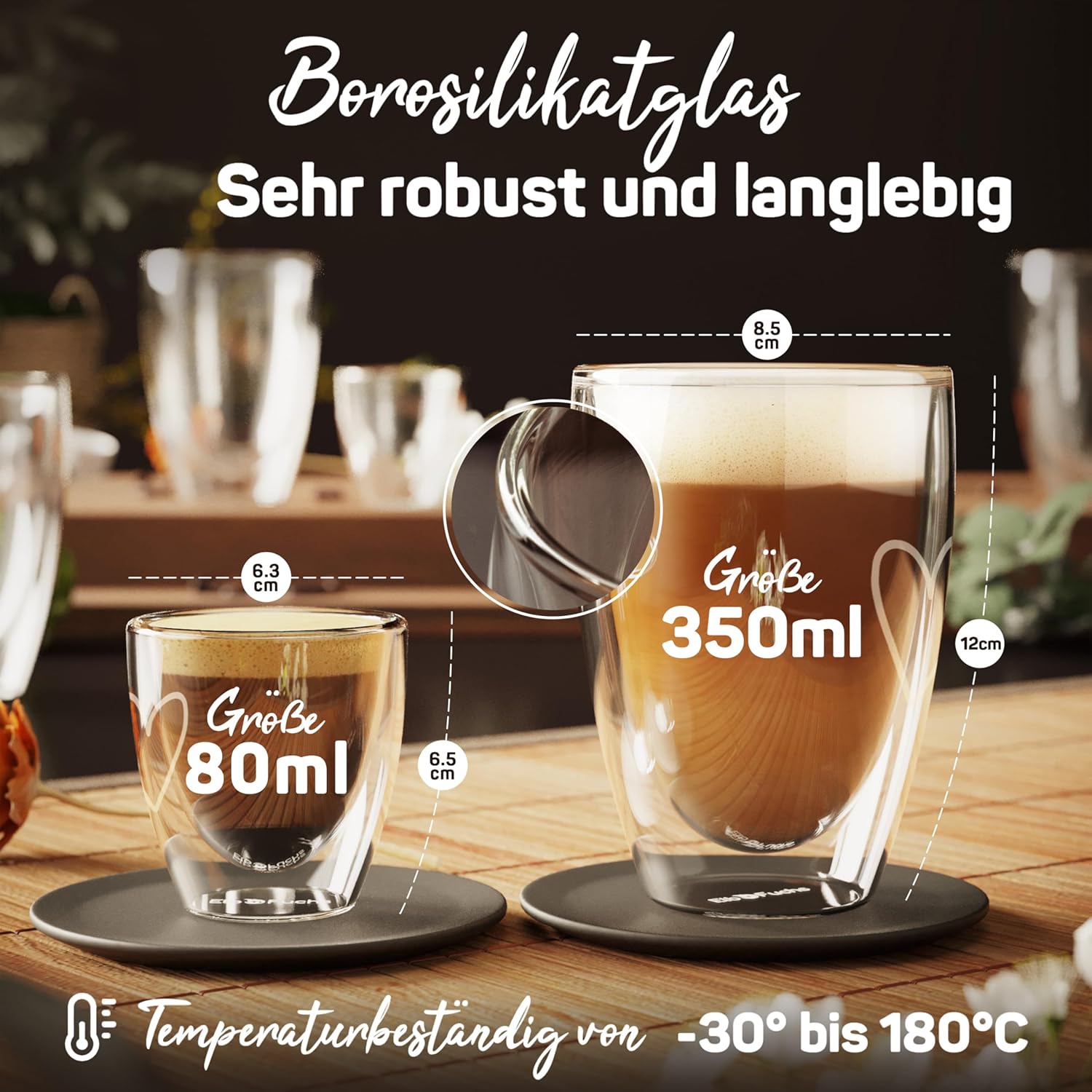 • : Нашите термо чаши с двойни стени са не само подходящи за съдомиялна машина и за всички обикновени автоматични кафе машини, но могат да се използват без колебание и в микровълнова фурна или хладилник, от -30° до +180°.