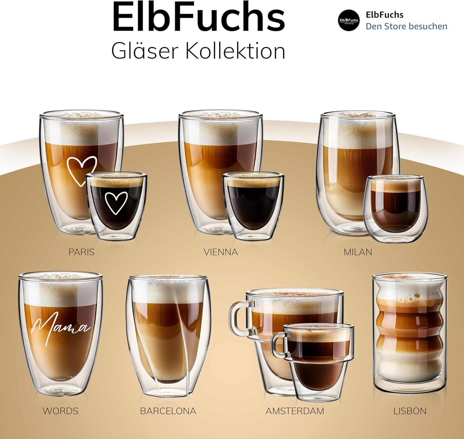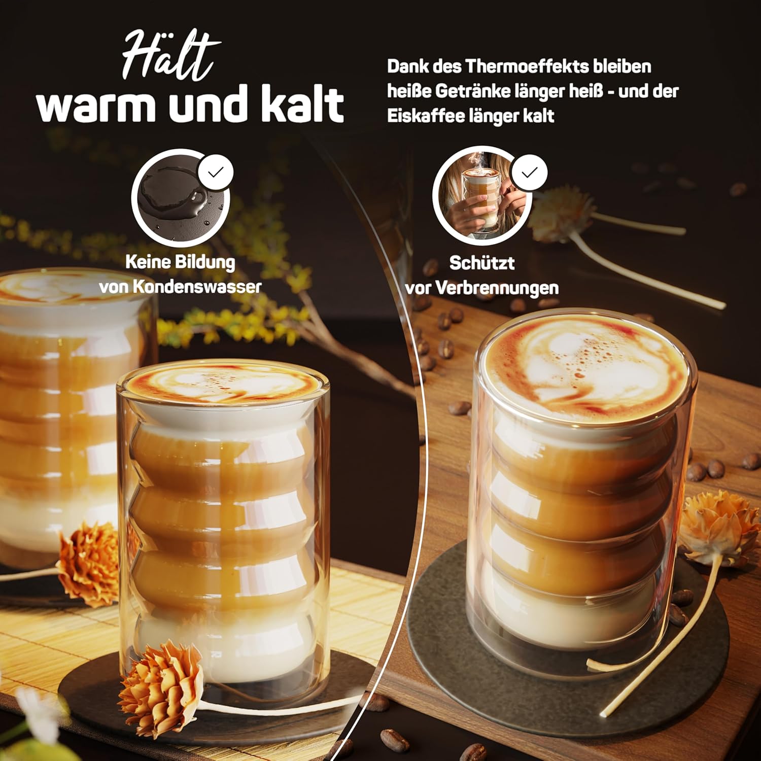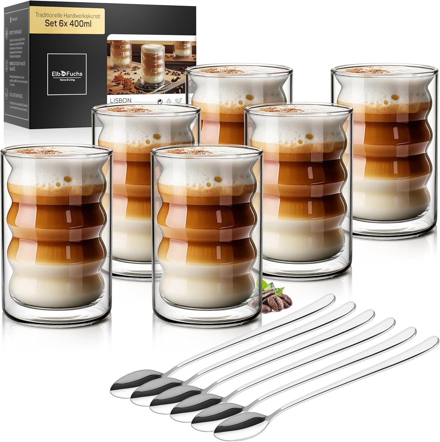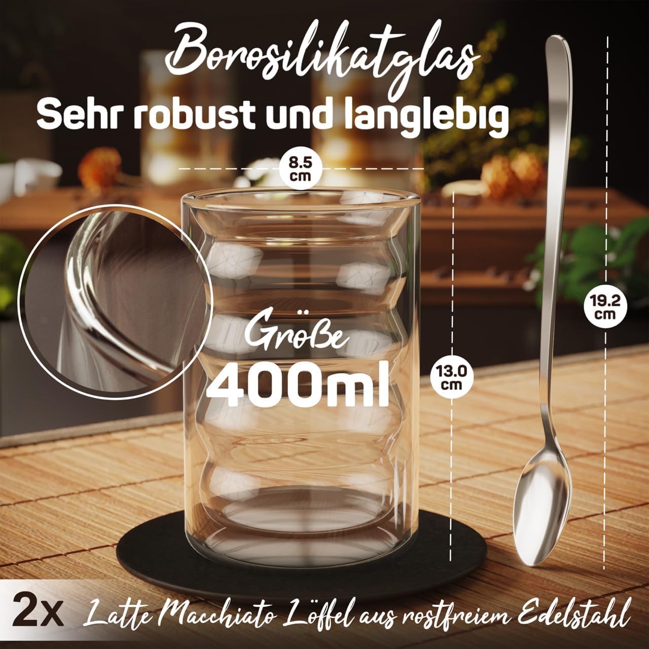 • : Комплектът от стъклени чаши с двойни стени ElbFuchs [4×400 мл] с елегантни лъжички от неръждаема стомана е оригинална идея за подарък за любители на кафето, рождени дни или като стилен аксесоар в кухнята.