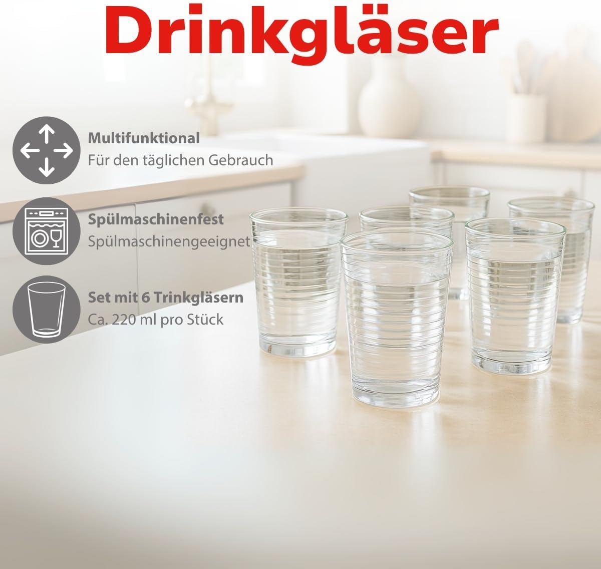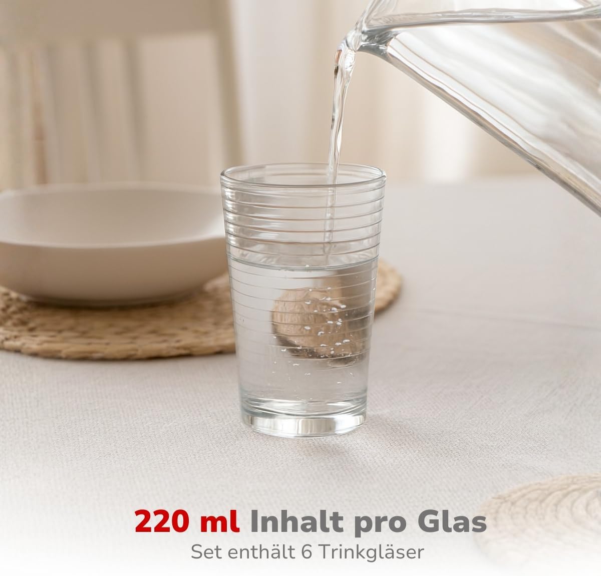 • КОМПЛЕКТ ОТ 6 ЧАШИ ЗА ПИЕНЕ - Този комплект чаши се състои от 6 прозрачни стъклени чаши за пиене, всяка с обем приблизително 220 мл – идеални за ежедневна употреба с вода, сок или лимонада.