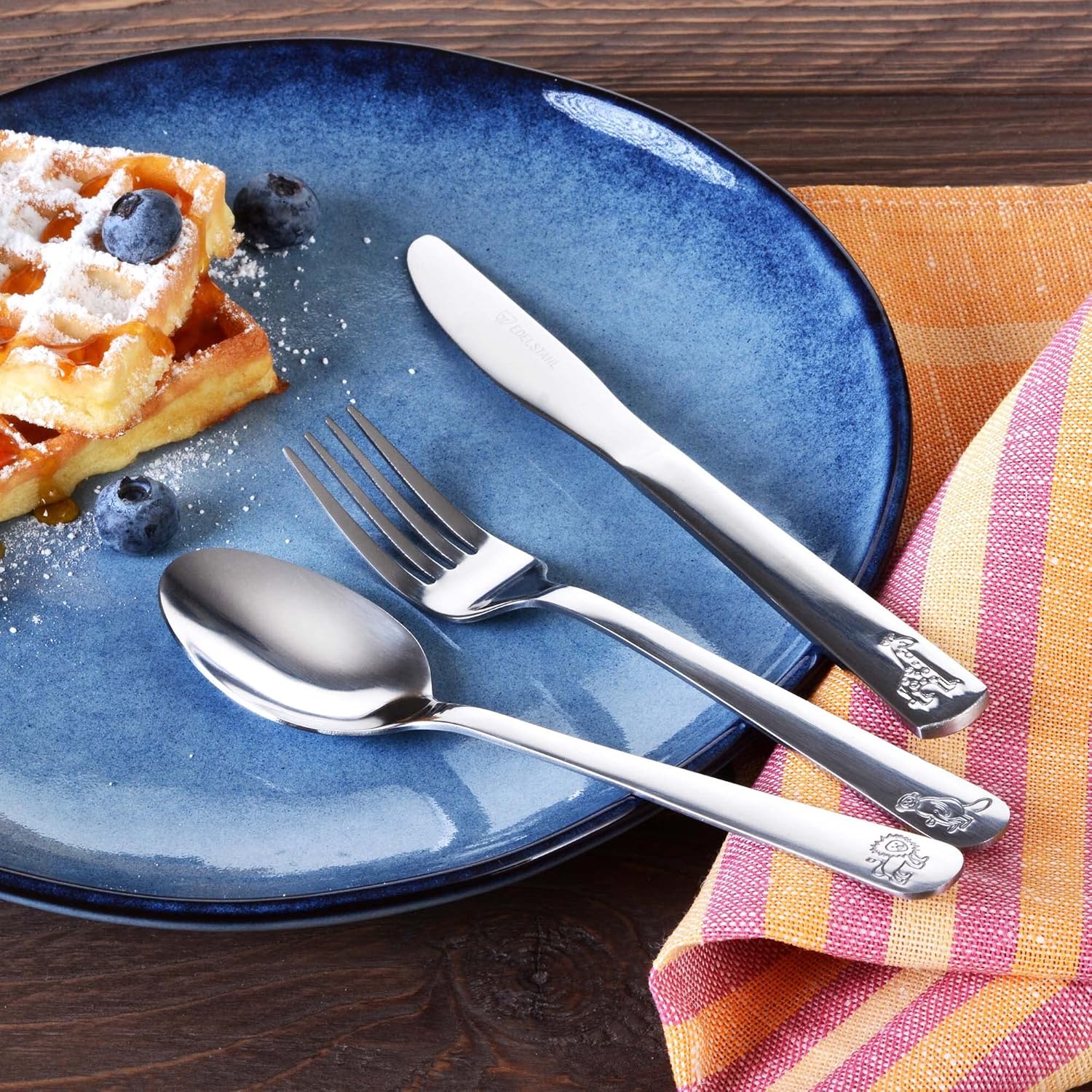 . Семпъл детски прибор за хранене за ежедневна употреба с животински мотиви по дръжките. Приборите са изработени от неръждаема стомана 18/0