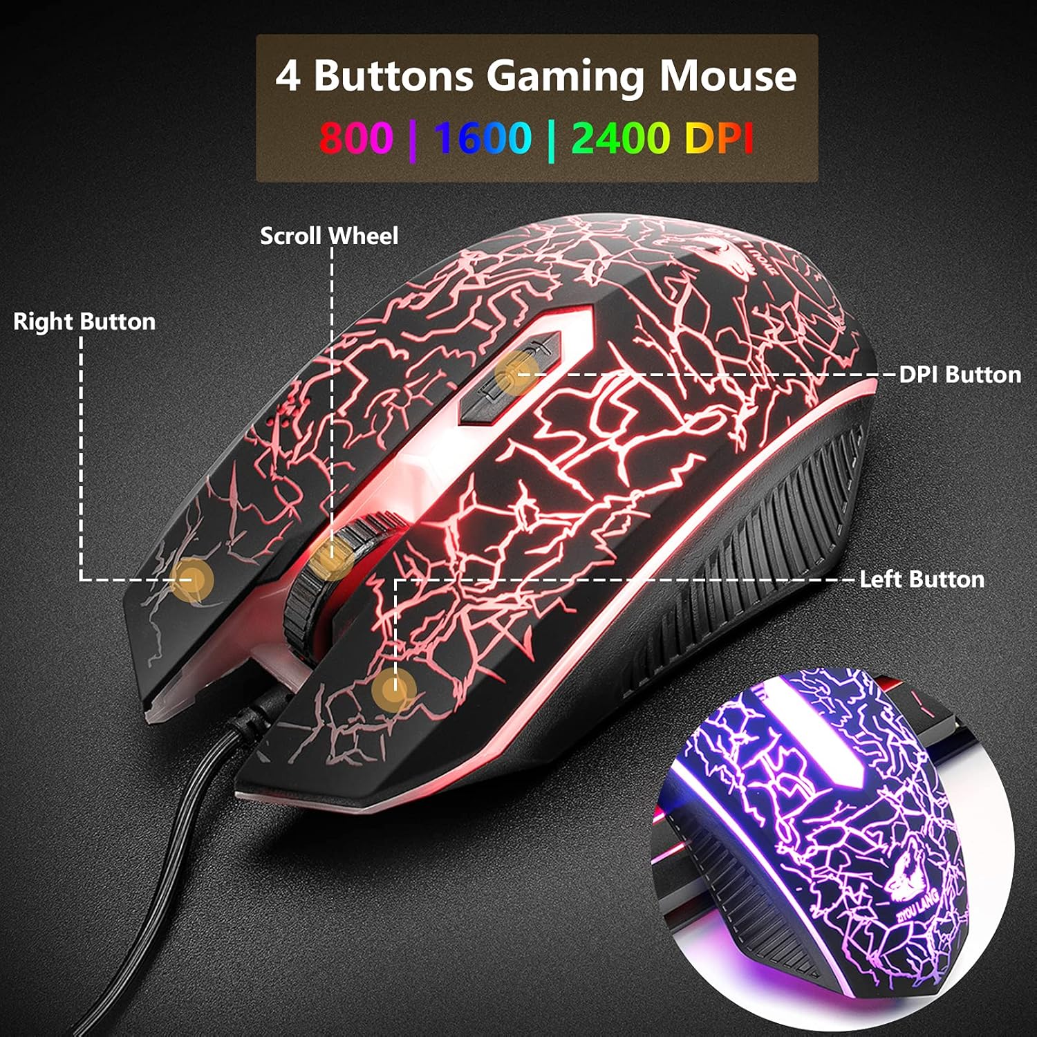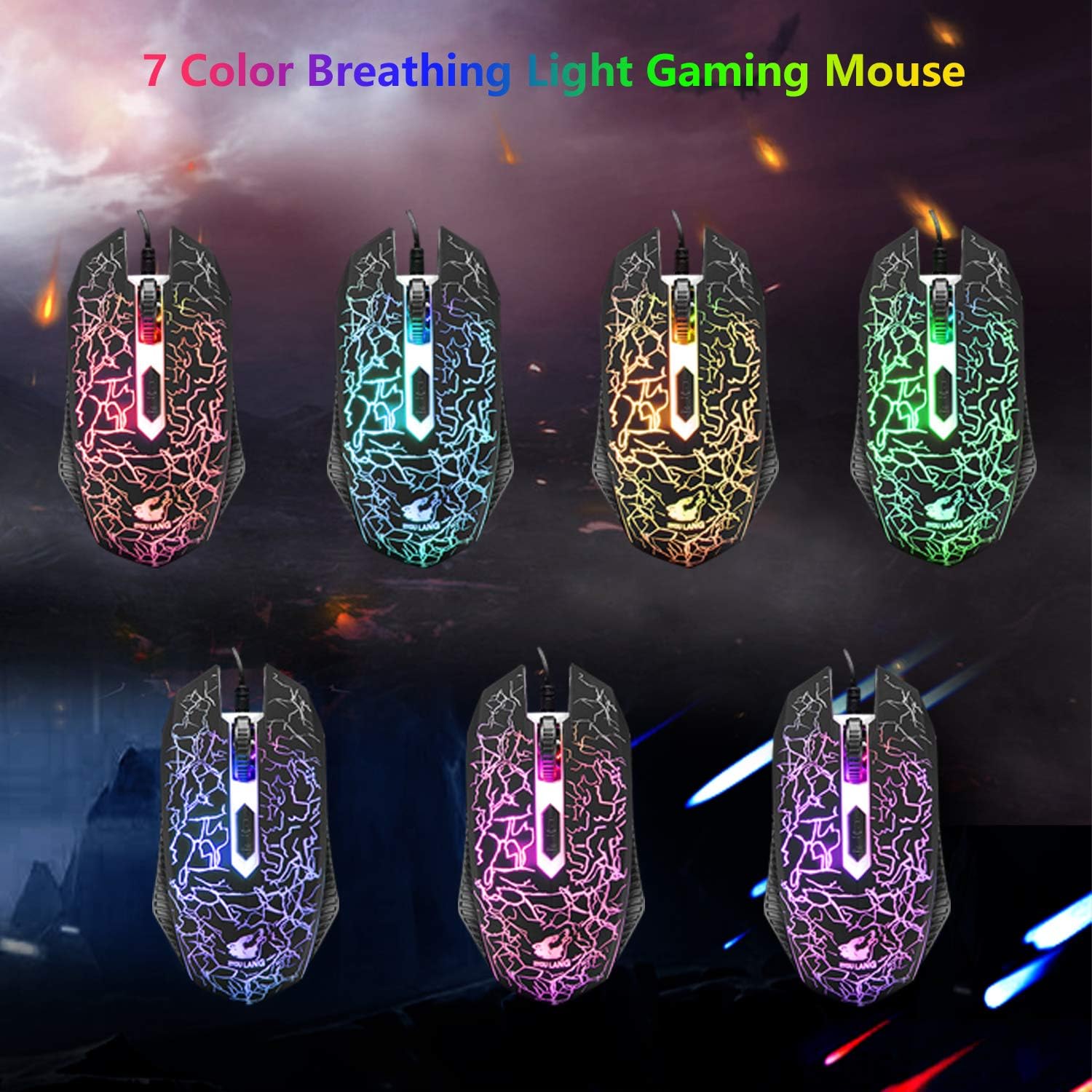 • ЦВЕТНА ГЕЙМЪРСКА МИШКА: 7-цветна геймърска мишка с дихаща светлина, невероятни светлинни ефекти, 4-бутонна мишка, неплъзгащ се дизайн, ергономичен дизайн, удобно усещане, без болка дори след продължителна употреба. 3 регулируеми нива на DPI: 800/1600/2400 DPI Забележка: Няма бутони за управление на светлината. USB кабел: 1,5 м