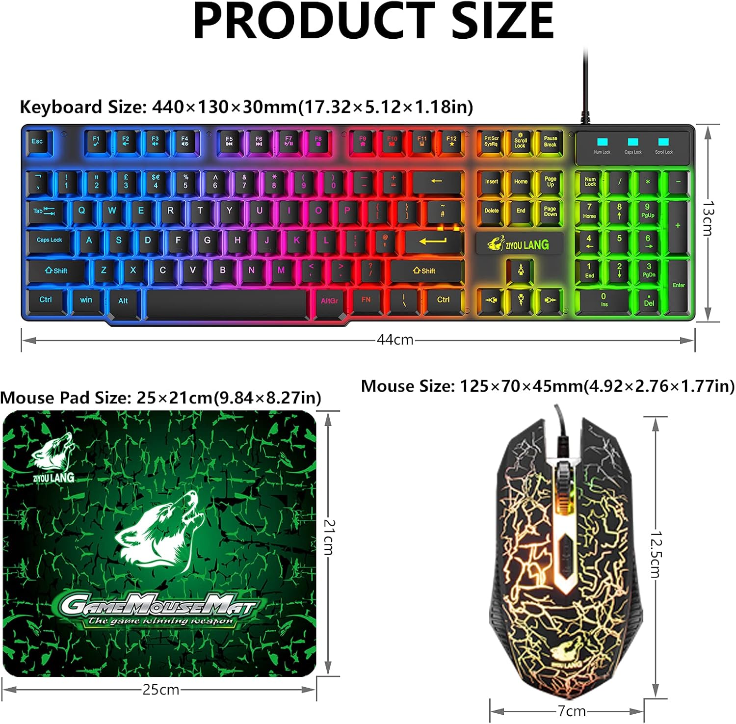 • ГЕЙМЪРСКА КЛАВИАТУРА С ВЕЛИКОБРИТАНИЯ: Геймърската клавиатура с Rainbow LED подсветка ви предлага цветно изживяване при писане и нощна игрова атмосфера. FN + scroll lock = включване/изключване на подсветката, FN + ↑/↓ = увеличаване/намаляване на яркостта на подсветката. UK подредба, 104 клавиша, 19 клавиша без конфликти, 12 мултимедийни клавиша, 50 милиона натискания. USB кабел: 1,5 м