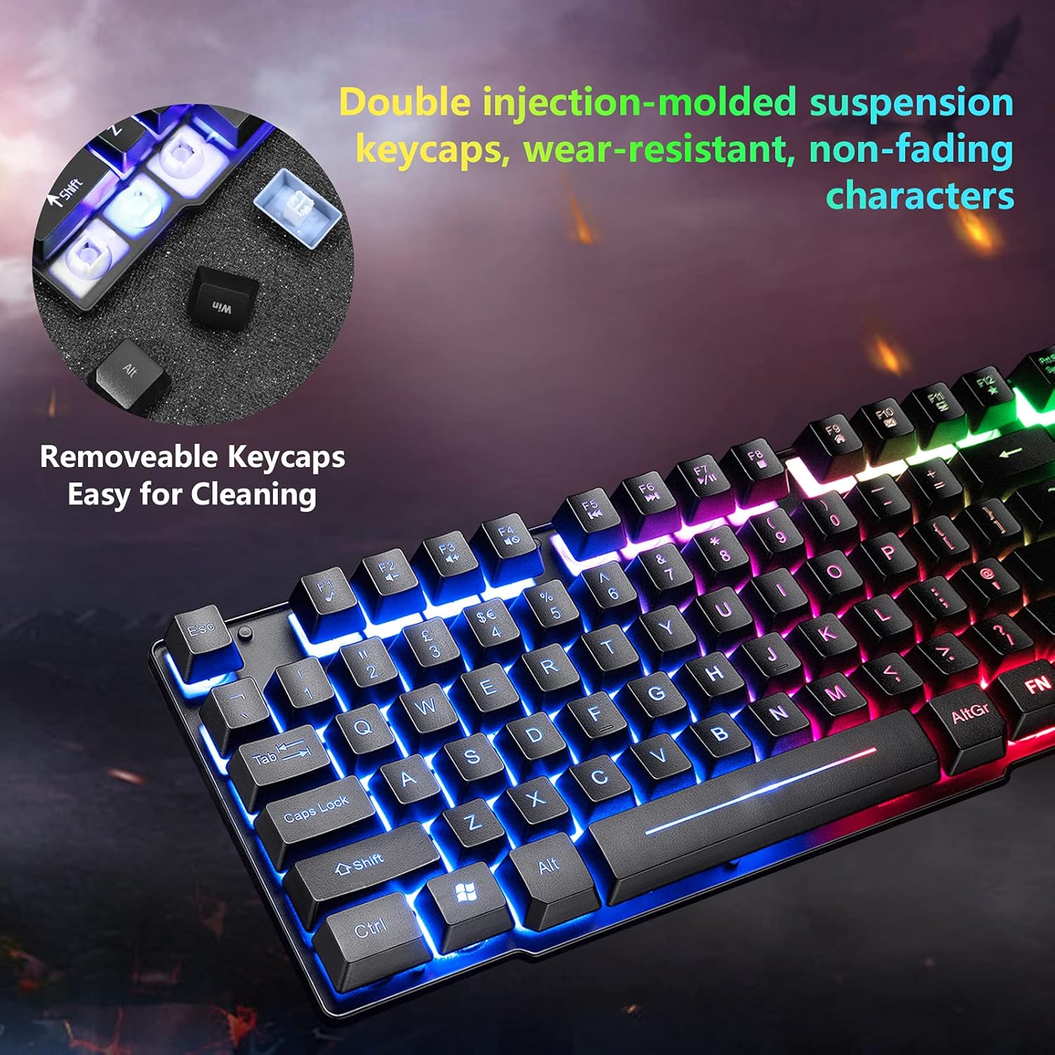 • IPX5 ВОДОУСТОЙЧИВОСТ: IPX5 водоустойчива клавиатура, окачени клавиши, двуцветна шприцвана клавиатура, предотвратява пръски вода, намалява възможността от повреждане на клавиатурата от вода и напитки. Свалящи се бутони, лесно почистване на клавиатурата.