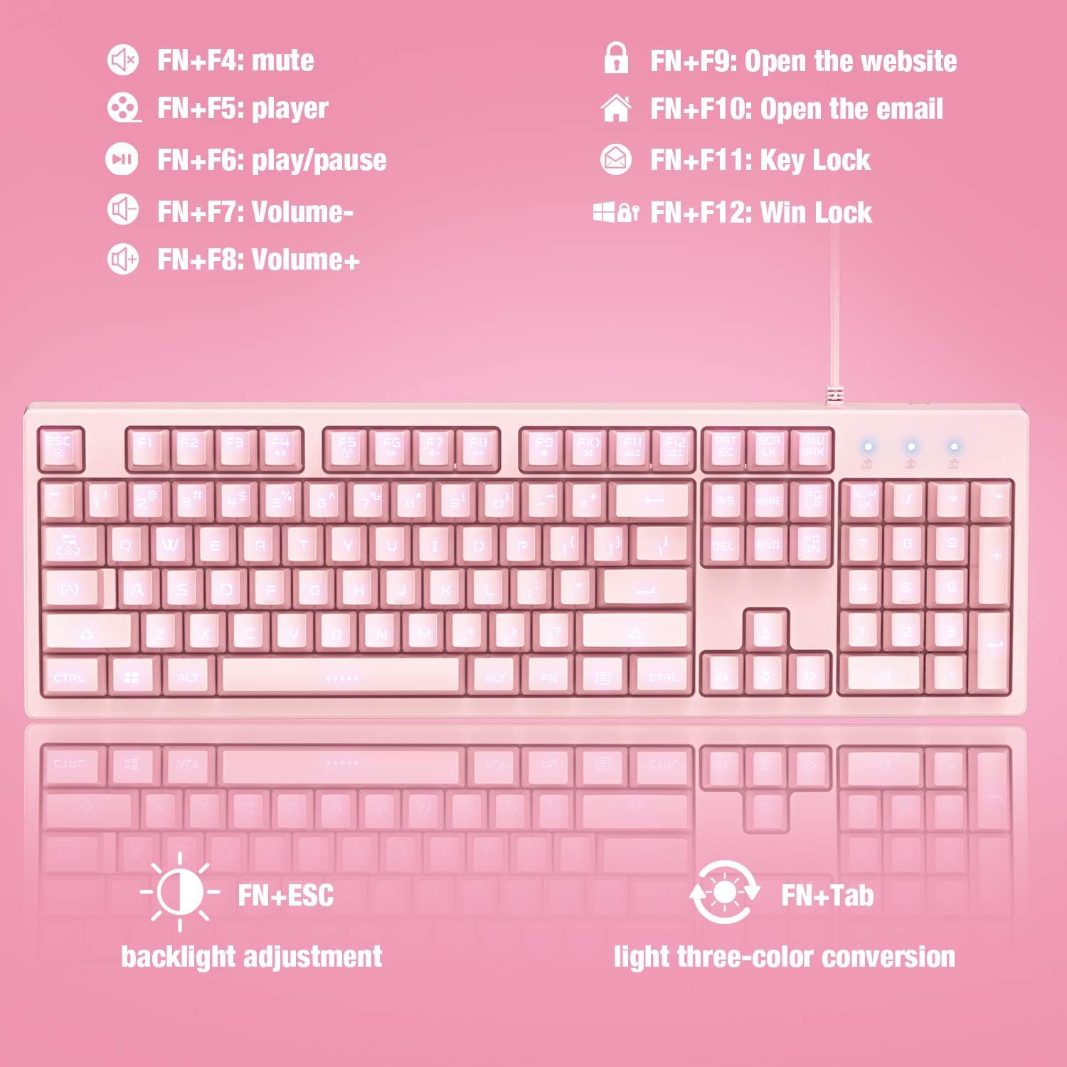 Клавиатурата с LED светлина в Ajijar pink има 3 монохромни режима на осветление в бяло, лилаво и розово. Натиснете fn+esc, за да регулирате яркостта на осветлението, и натиснете fn+tab, за да промените цвета на осветлението. Здрави превключватели Клавиатурата използва здрави превключватели за своите стандартни 104 клавиша с класическо оформление. Насладете се на удобно писане и дълготрайна употреба. Водоустойчивата клавиатура на Ajijar pink с дизайн, устойчив на пръски. Разлята вода или кафе по време на ежедневна игра и работа могат лесно да се почистят и няма да повредят бутоните. RGB геймърската мишка Ajijar осигурява удобен захват с нокти и продължителна употреба без умора. Регулируем DPI превключвател на скоростта на RGB геймърските мишки, с 6 регулируеми DPI превключвателя за скорост: 800, 1600, 2400, 3200, 4800, 6400, можете да контролирате скоростта по-лесно. RGB цветовете на осветлението - многоцветните светлини ви предлагат шикозна геймърска среда и подчертават вашата геймърска атмосфера. Ajijar Pink геймърската мишка ви дава пълна персонализация за вашия геймърски компютър и геймърски лаптоп. 7 програмируеми бутона, ляв бутон, десен бутон, напред, назад, бутон dpi+, бутон dpi и колелце за скролинг, отговарят отлично на вашите изисквания за различни игри и ви позволяват бързо да превключвате между тях по време на игра.