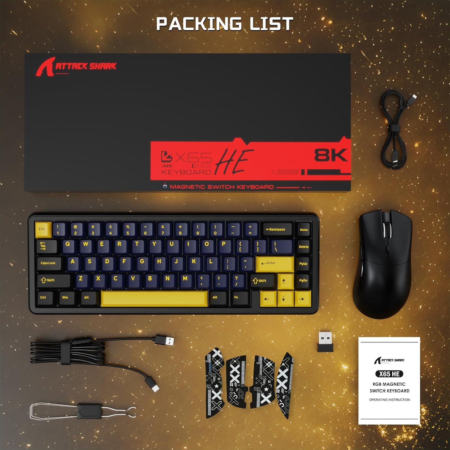 1 x клавиатура X65 HE; 1 x мишка R1; 1 x неплъзгаща се лента за захващане; 1 x адаптер (съхранява се на гърба на мишката); 1 x инструмент за сваляне на клавиши; 1 x капак за прах; 2 x USB-C кабела; 2 x ръководство (английският език не е гарантиран)