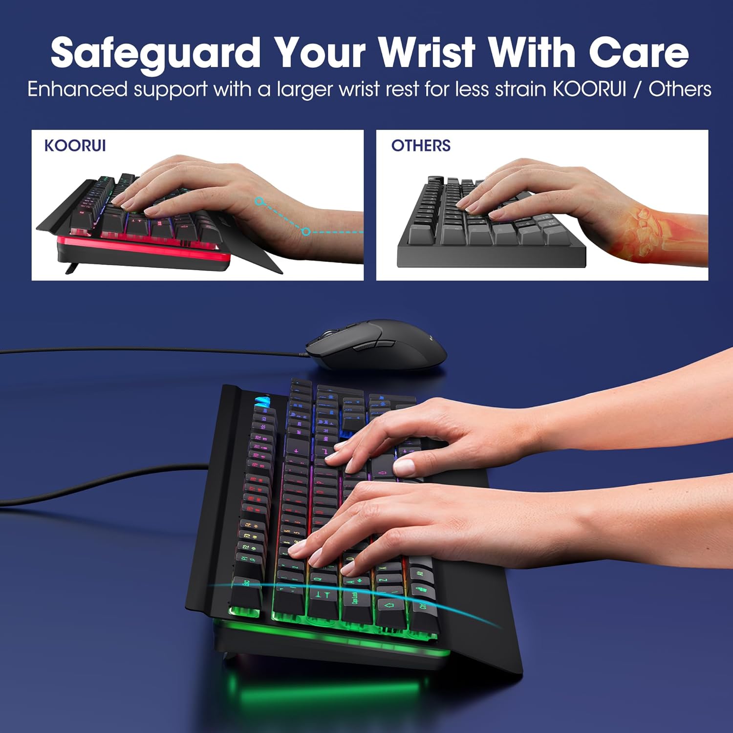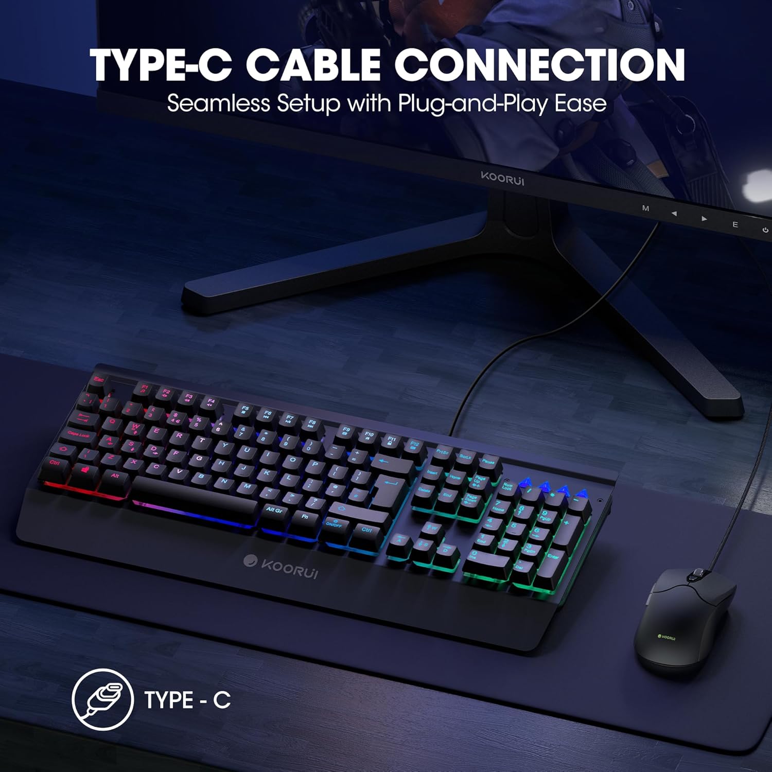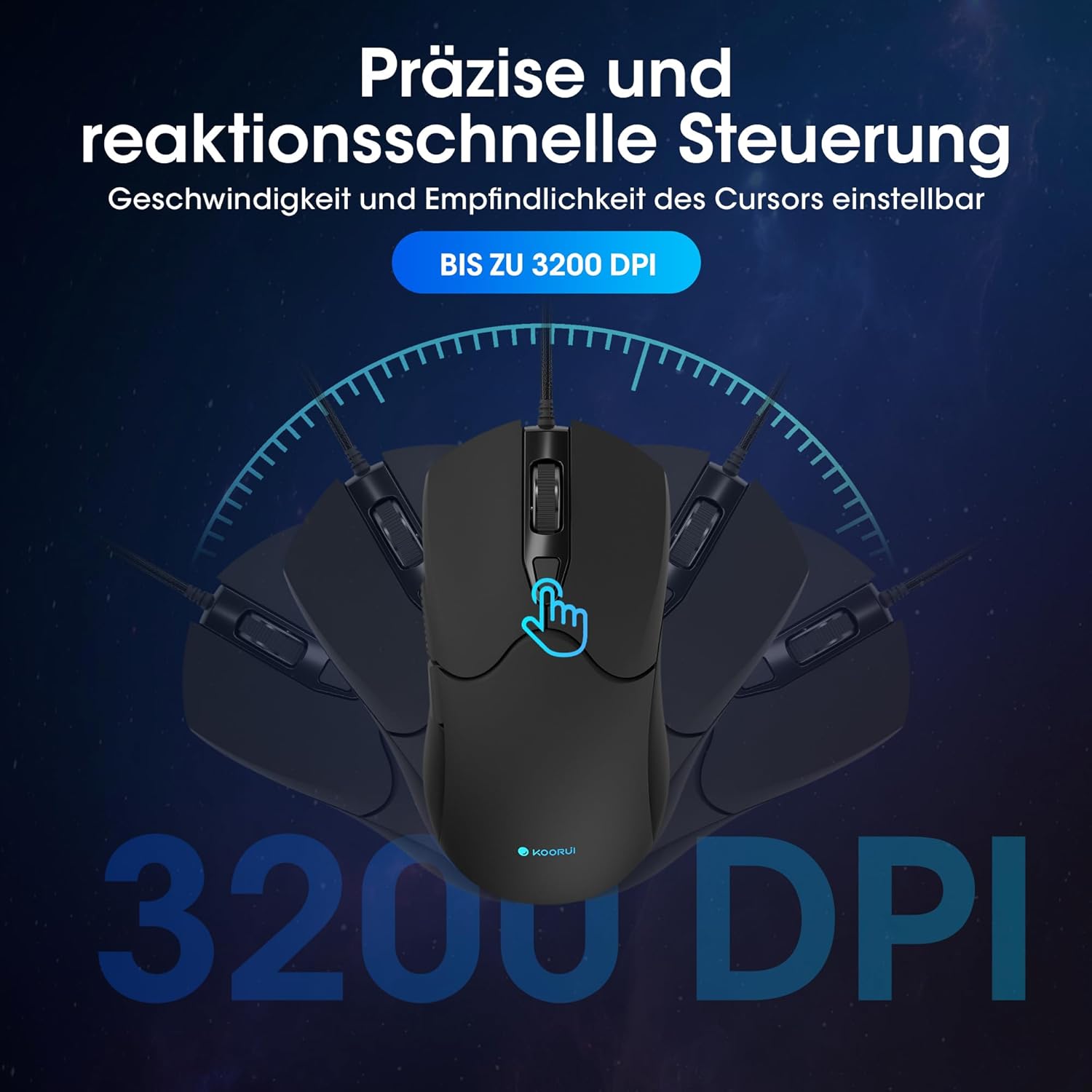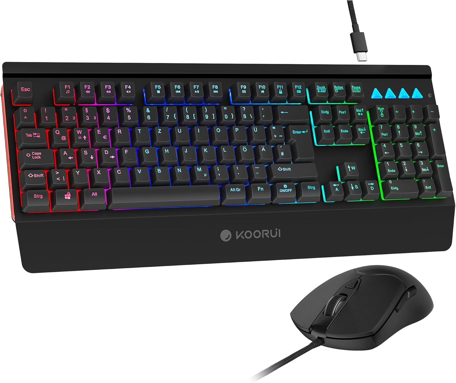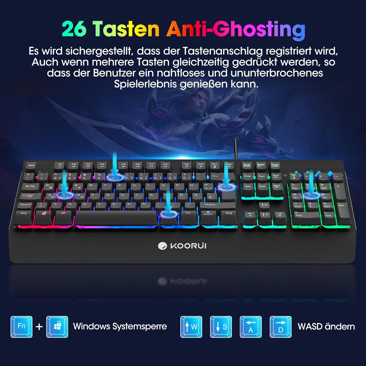 Комплект геймърска клавиатура и мишка KOORUI, немска QWERTZ подредба с поставка за китката, защита от ghosting, клавиатури, USB кабел, 12 мултимедийни клавиша и мишка с 6 бутона, 3200 DPI за Windows, MacOS, Linux.