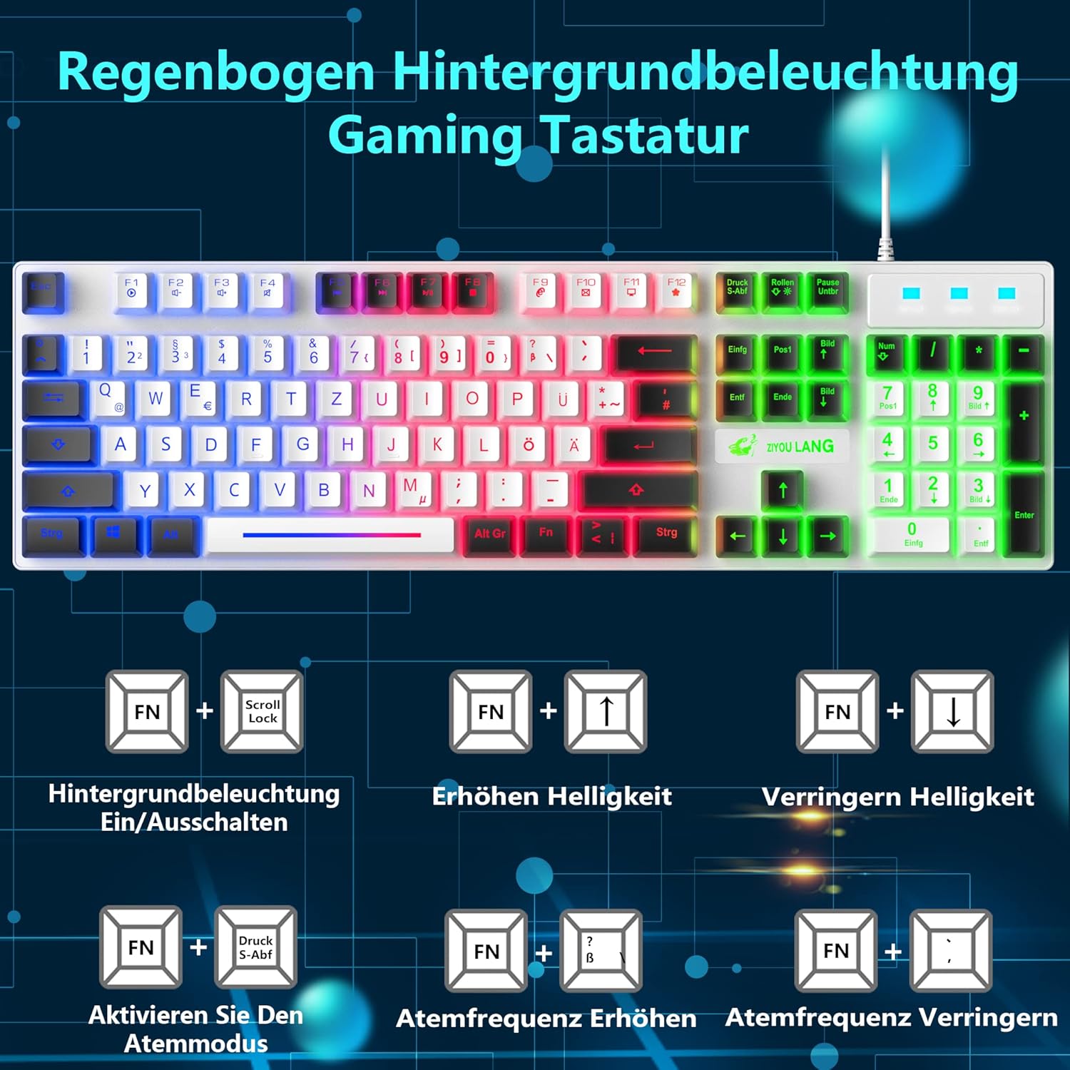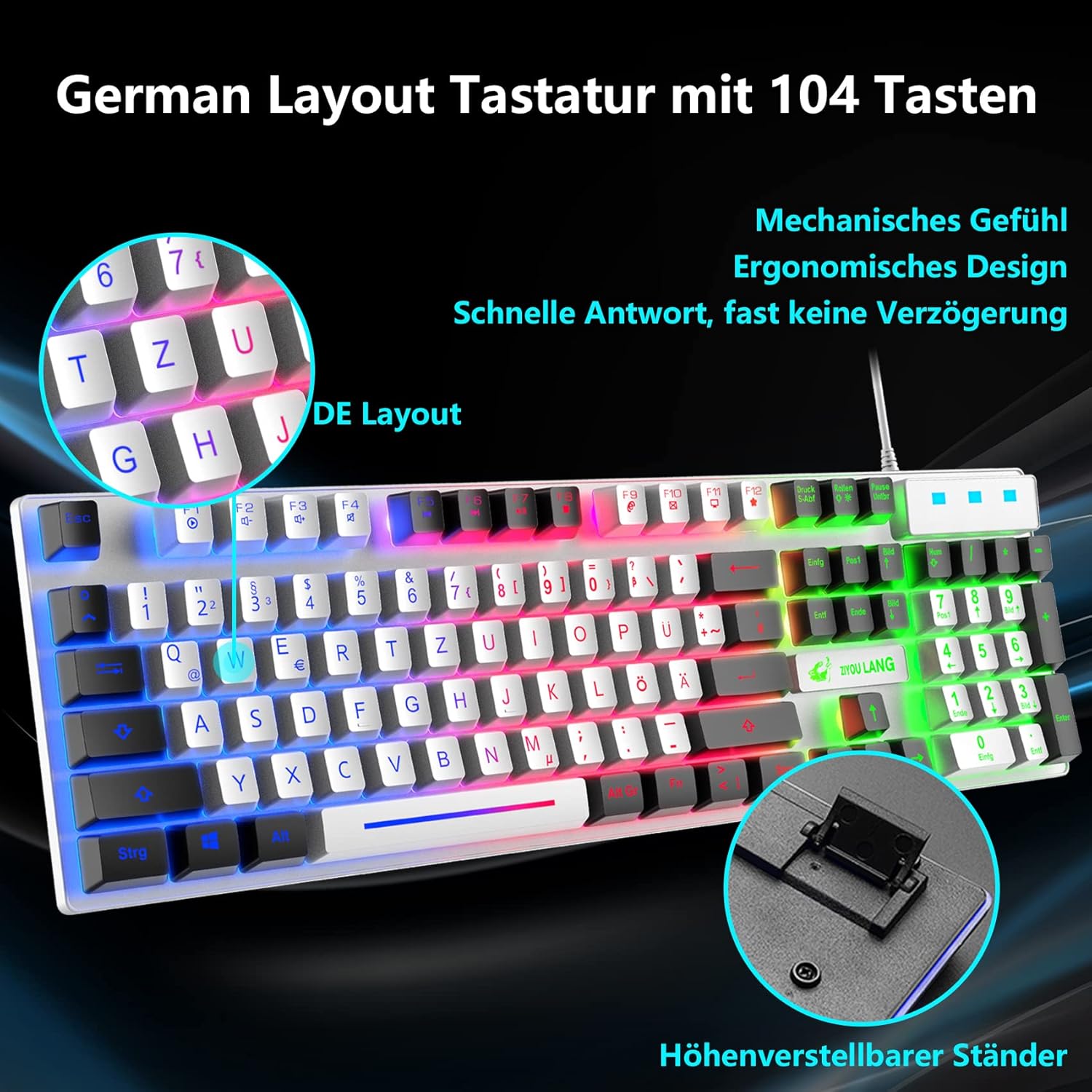 • Геймърска клавиатура с немска подредба: геймърската клавиатура с дъгова LED подсветка ви предлага цветно изживяване при писане и нощна игрова атмосфера. FN + ролки = превключвател за включване/изключване на подсветката, FN + ↑/↓ = увеличаване/намаляване на яркостта, FN + натиск S-Abf = активиране на режим на дишане, FN + ?/、 = увеличаване/намаляване на честотата на дишане. Немска подредба, 104 клавиша, 19 клавиша без конфликти, 12 мултимедийни клавиша, 50 милиона натискания. USB кабел: 1,5 м