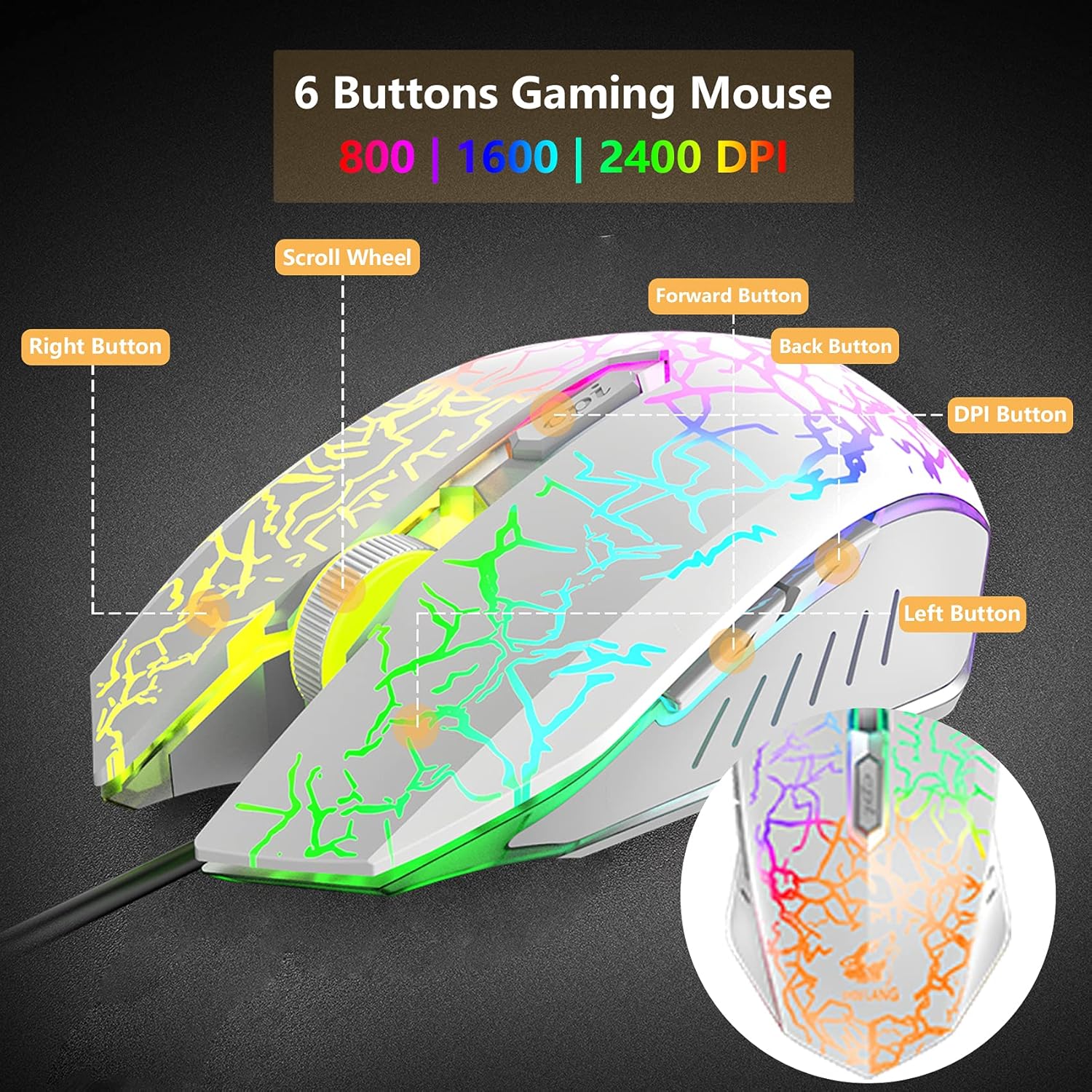 • Цветна играчка мишка: 7-цветна геймърска мишка с дихаща светлина, невероятни светлинни ефекти, 6-бутонна мишка, неплъзгащ се дизайн, ергономичен дизайн, удобно усещане, без болка дори след продължителна употреба. 3 регулируеми нива на DPI: 800/1600/2400 DPI Забележка: Няма бутони за управление на светлината. USB кабел: 1,5 м