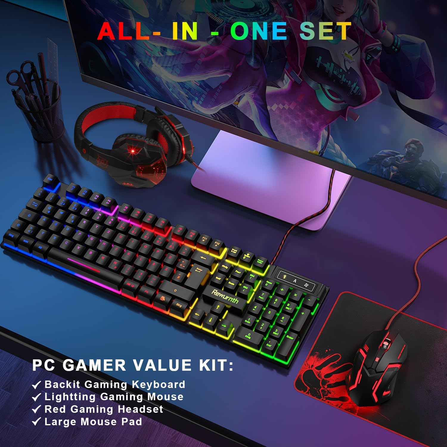 Комплект геймърска клавиатура и мишка Rewurnth със слушалки, QWERTZ DE подредба, RGB осветена клавиатура, 4-цветна LED геймърска мишка, слушалки за уши, голяма подложка за мишка, USB кабел за PC Mac PS5 Xbox