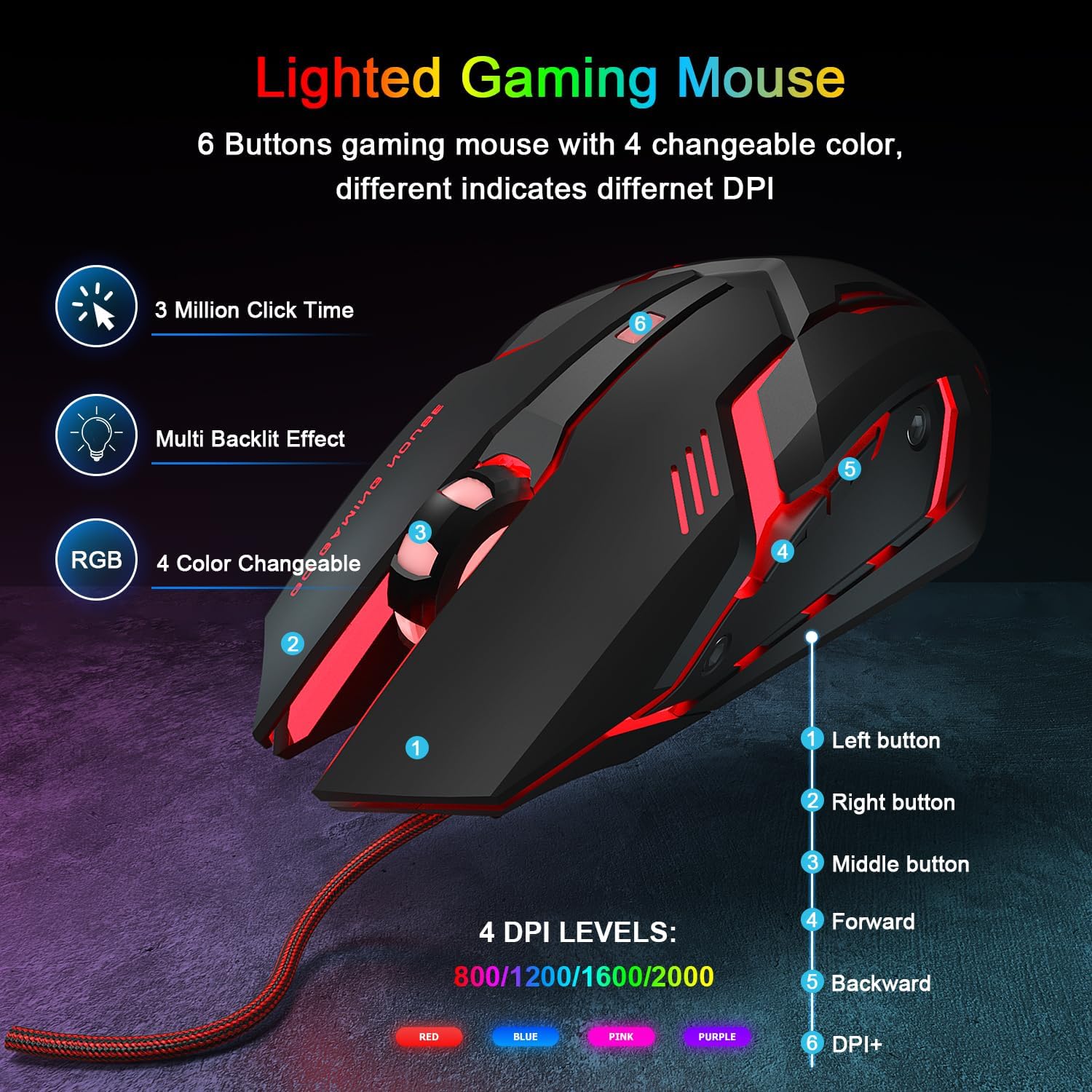 • Прецизна геймърска мишка с регулируема DPI - Тази мишка с 6 бутона има бутони за навигация напред и назад за лесно сърфиране, както и четири нива на DPI (800/1200/1600/2000), които могат да се адаптират към различни изисквания за игра и работа. Ергономично проектирана за естествена стойка на ръката при продължителна употреба.