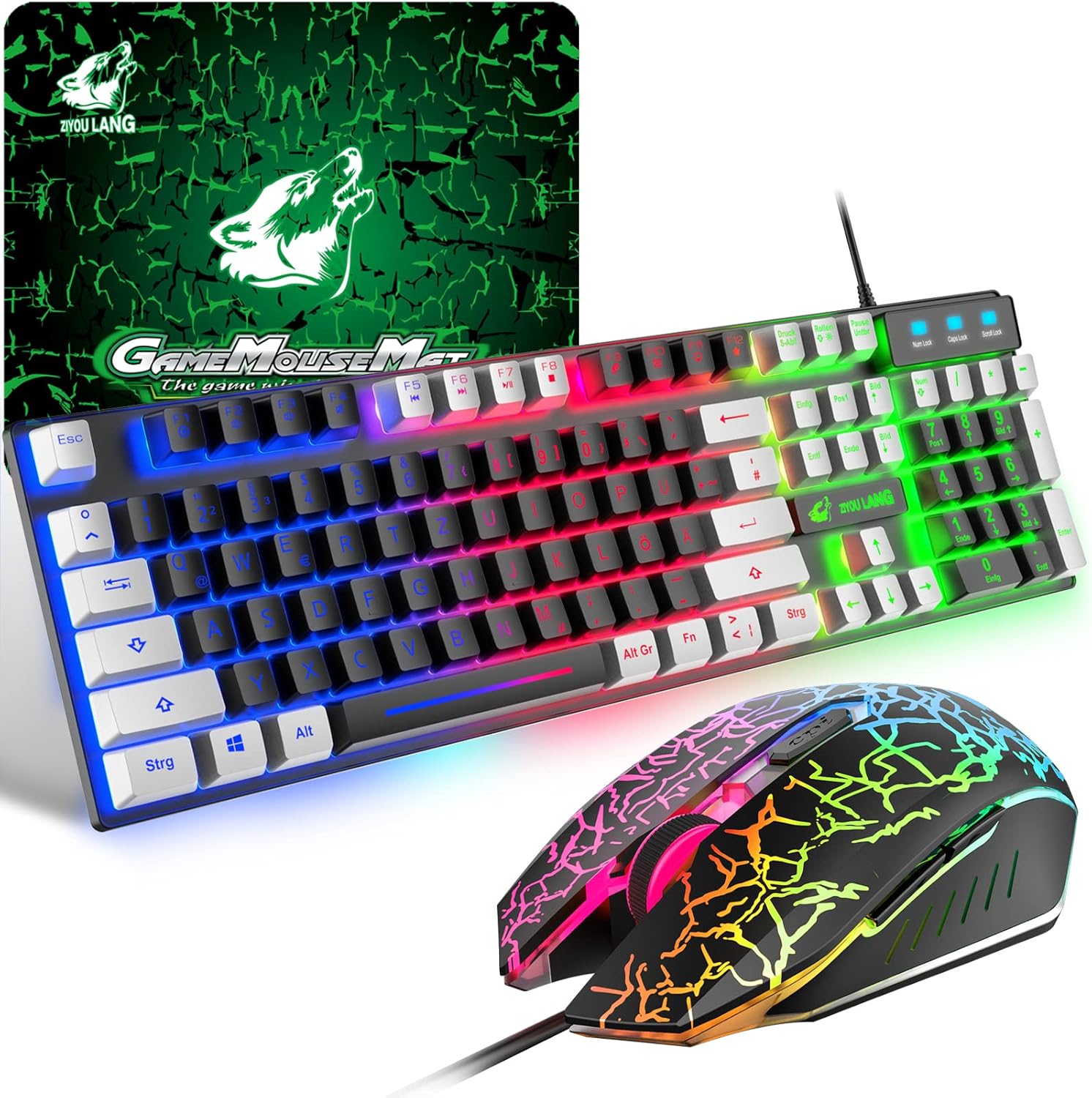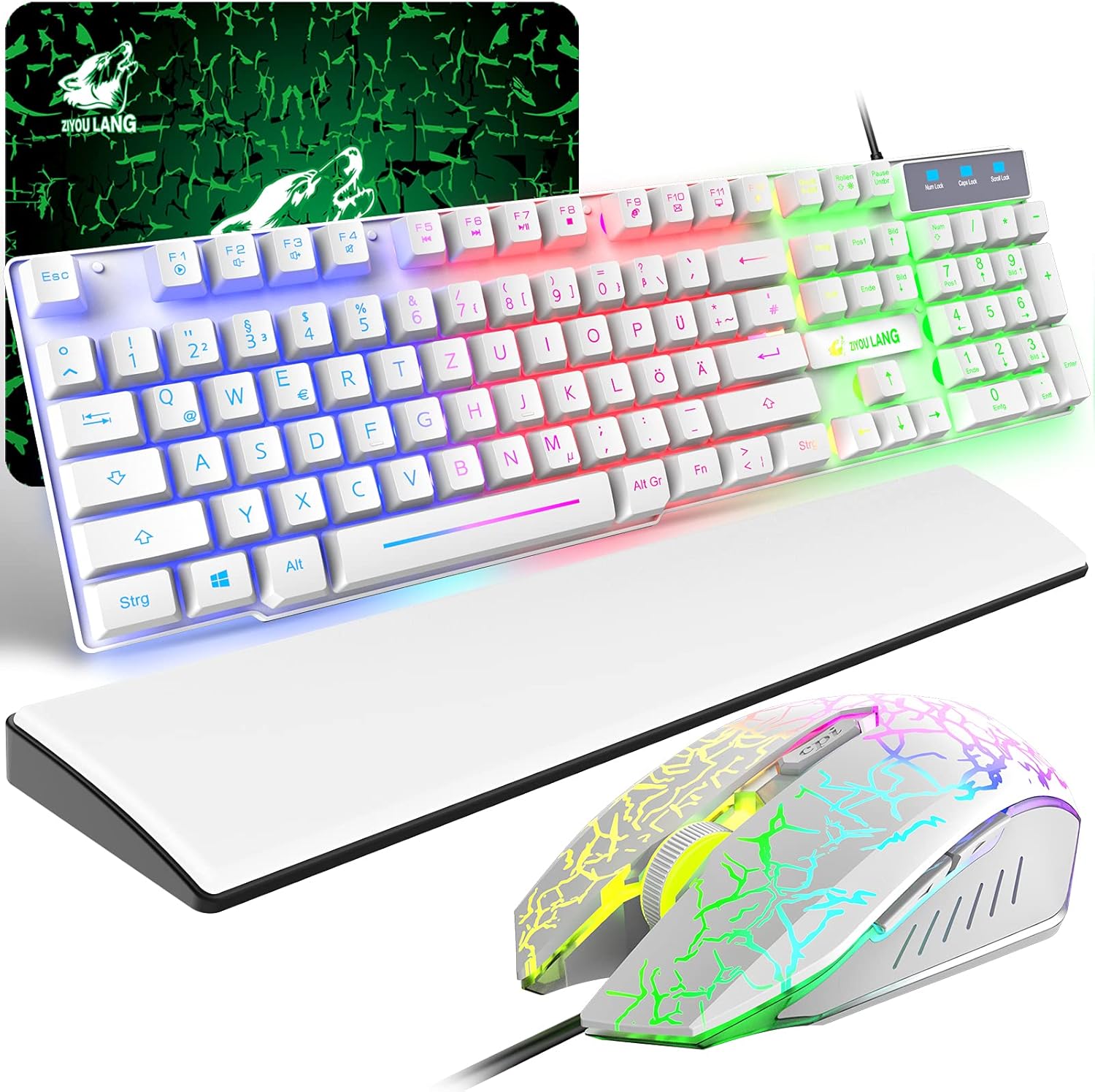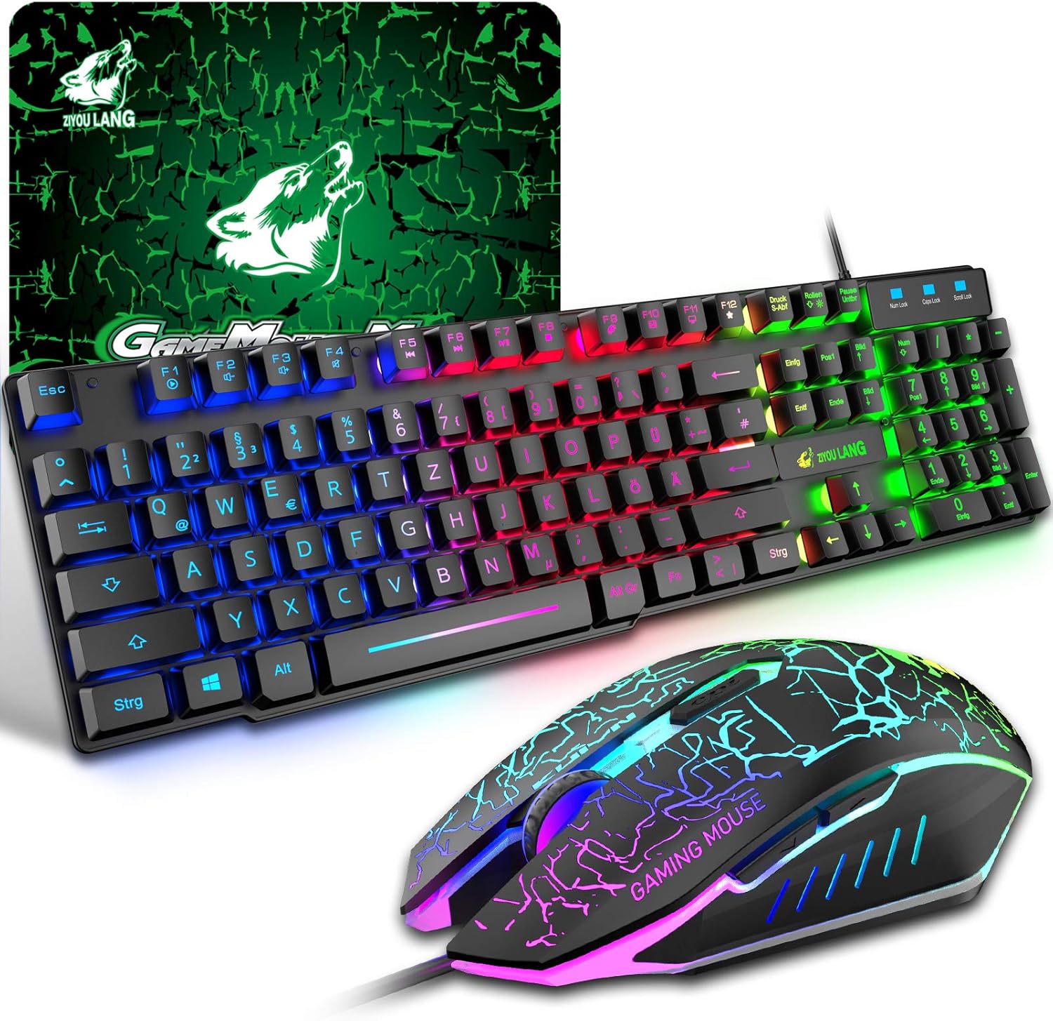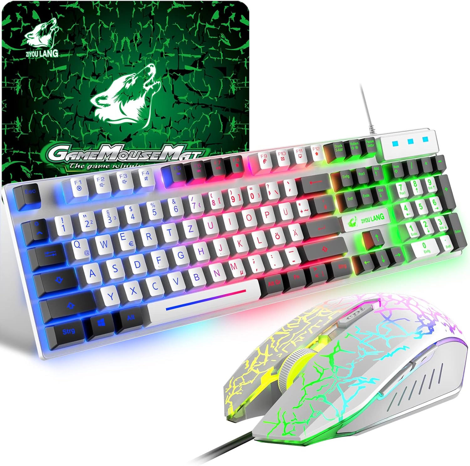 Комплект геймърска клавиатура и мишка T13, QWERTZ немска подредба, дъгова LED подсветка, ергономична клавиатура, 6 бутона, 2400 DPI мишка, USB кабел, съвместима с PS4 XBox