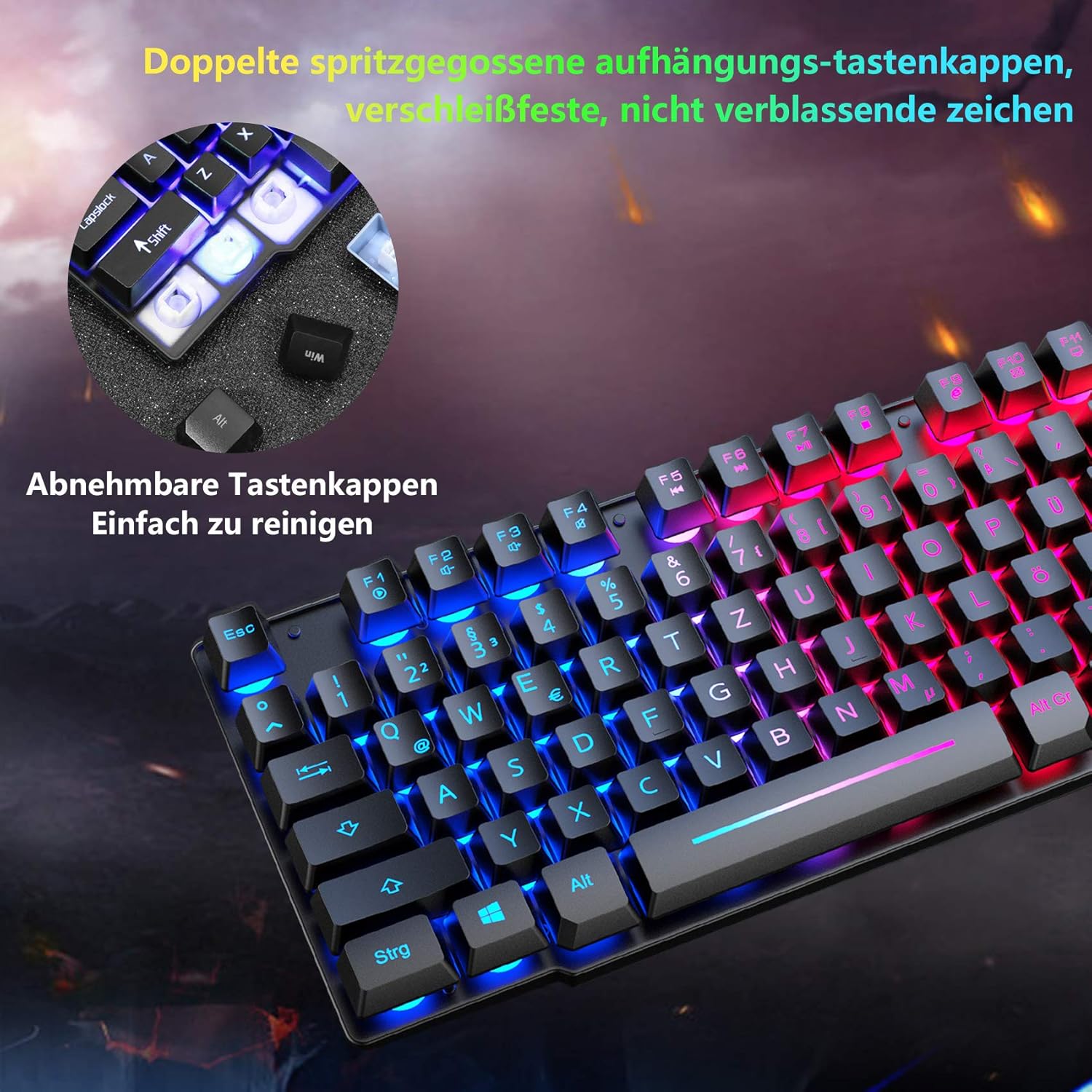 • Геймърска клавиатура с немска подредба: геймърската клавиатура с дъгова LED подсветка ви предлага цветно изживяване при писане и нощна игрова атмосфера. FN + ролки = превключвател за включване/изключване на подсветката, FN + ↑/↓ = увеличаване/намаляване на яркостта, FN + натиск S-Abf = активиране на режим на дишане, FN + ?/、 = увеличаване/намаляване на честотата на дишане. Немска подредба, 104 клавиша, 19 клавиша без конфликти, 12 мултимедийни клавиша, 50 милиона натискания. USB кабел: 1,5 м