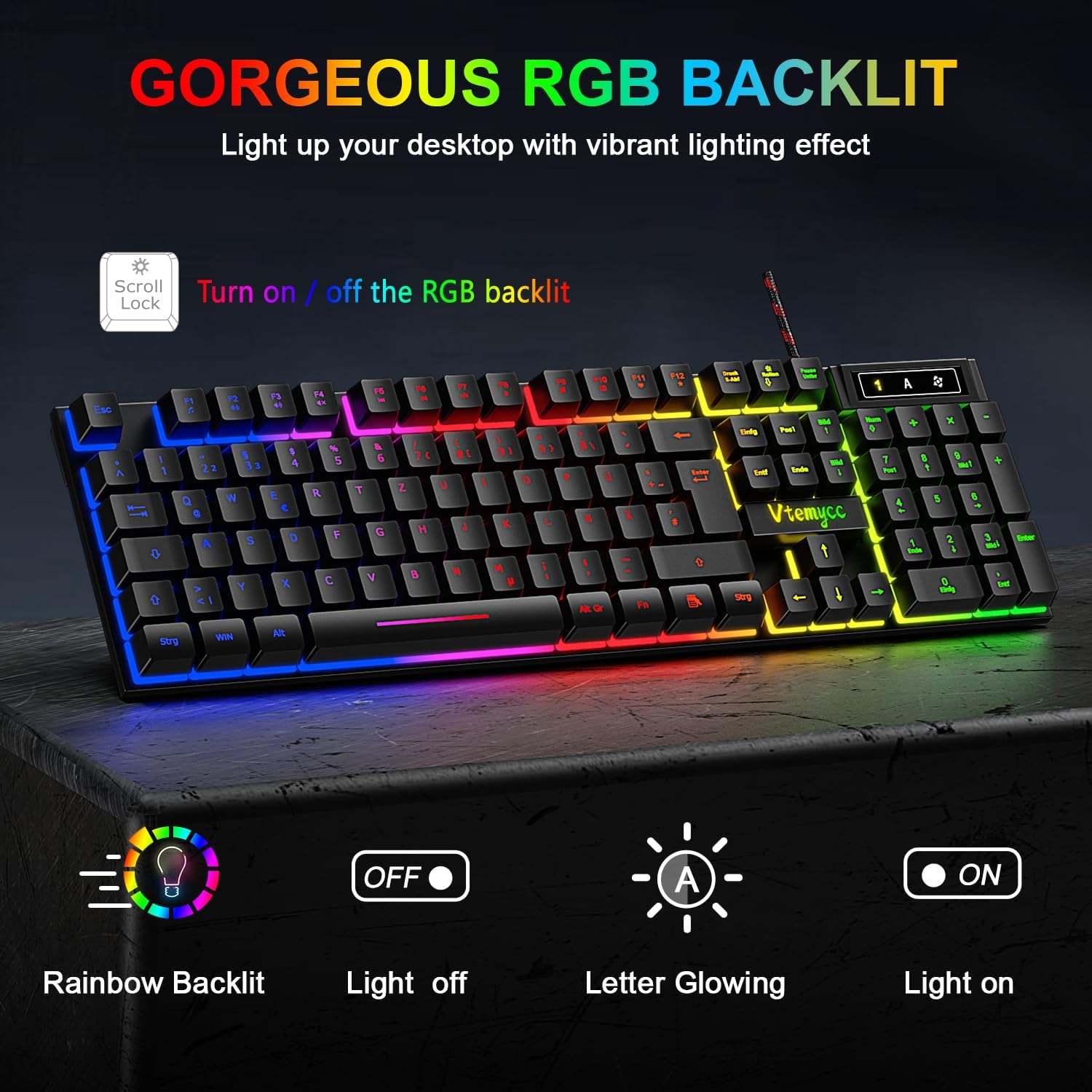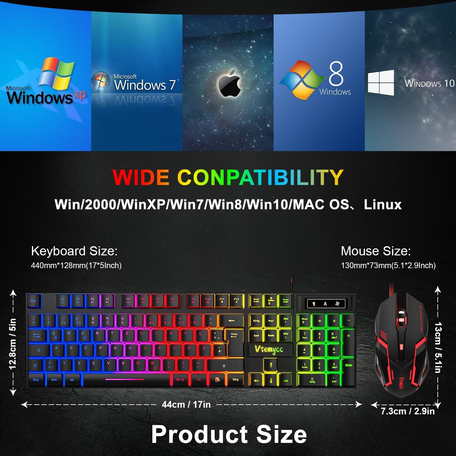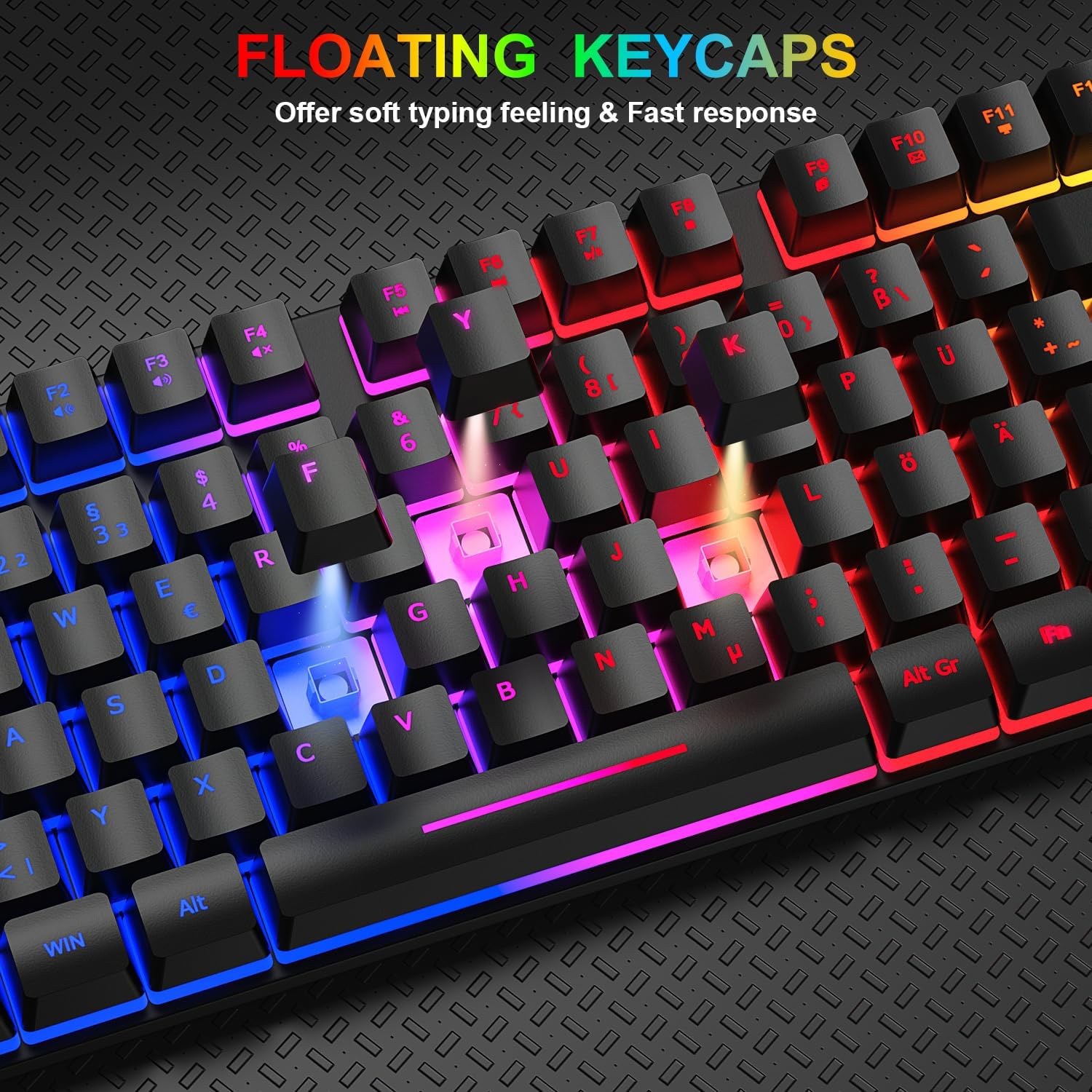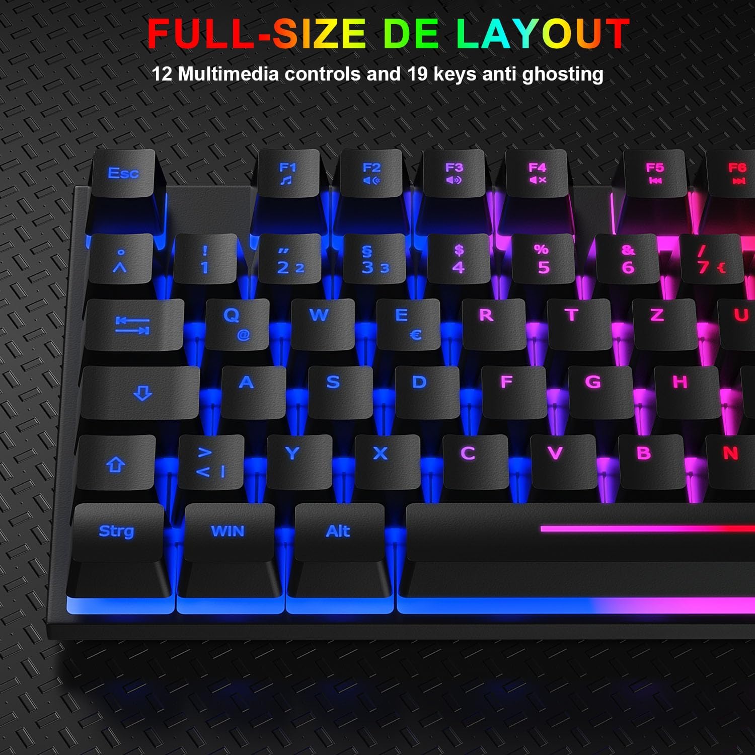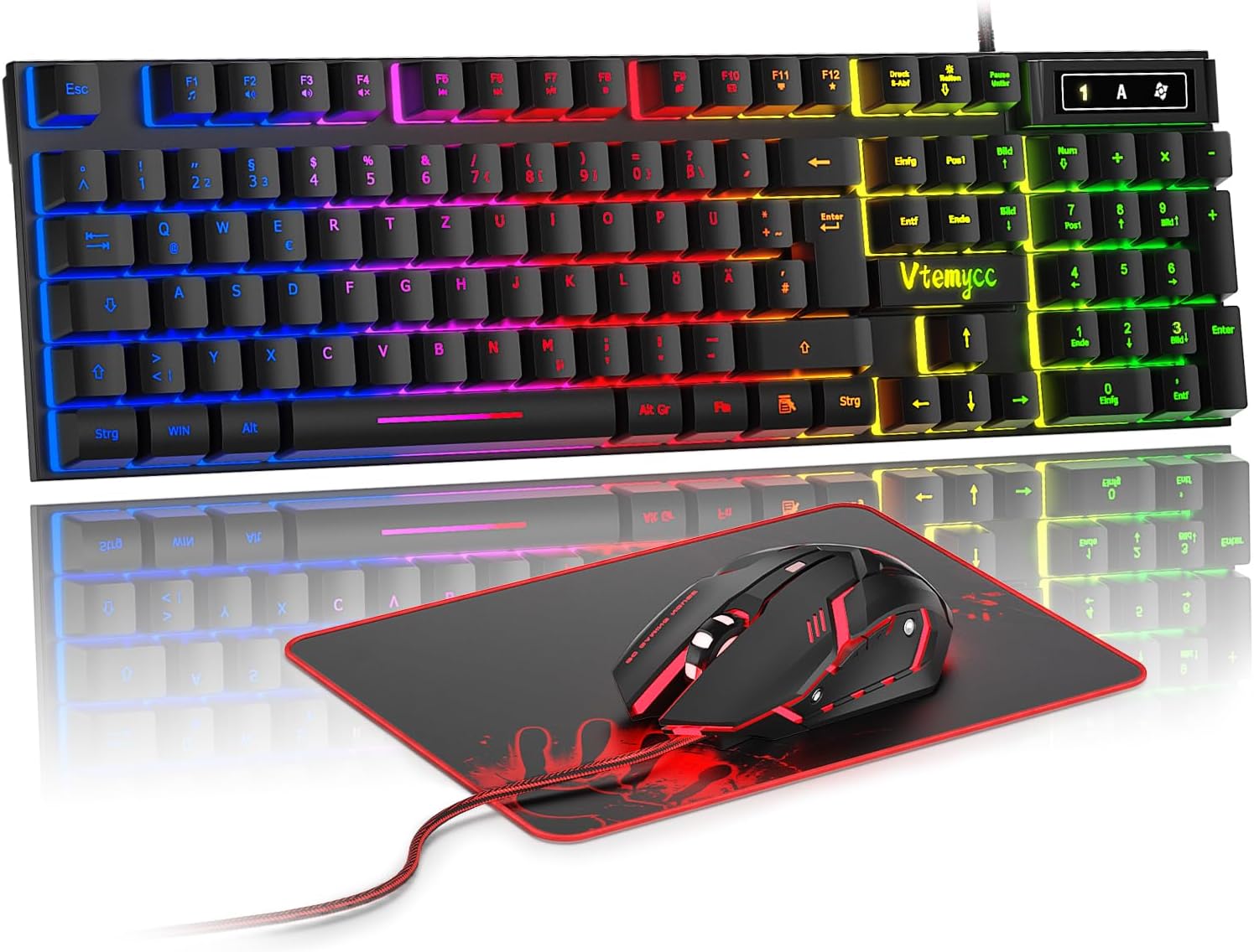 Комплект геймърска клавиатура и мишка Vtemycc, QWERTZ DE оформление, RGB подсветка на клавиатурата, 4 цвята, ергономична геймърска мишка, USB кабелна клавиатура и мишка с подложка за PC, Mac