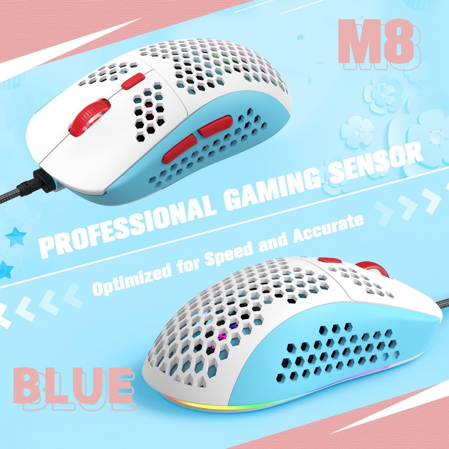• Лека мишка с форма на пчелна пита и цветни блокове: добре проектирана перфорирана тава с форма на пчелна пита, теглото на мишката е 69 (±5) g, мишката има високопрецизен оптичен сензор, 6-степенна регулируема DPI (800/1600/2400/3200/4800/6400), 6 програмируеми макро бутона. Включва вградени цветни блокове, висока производителност, комфорт и програмируемост и ви предлага уникално изживяване.