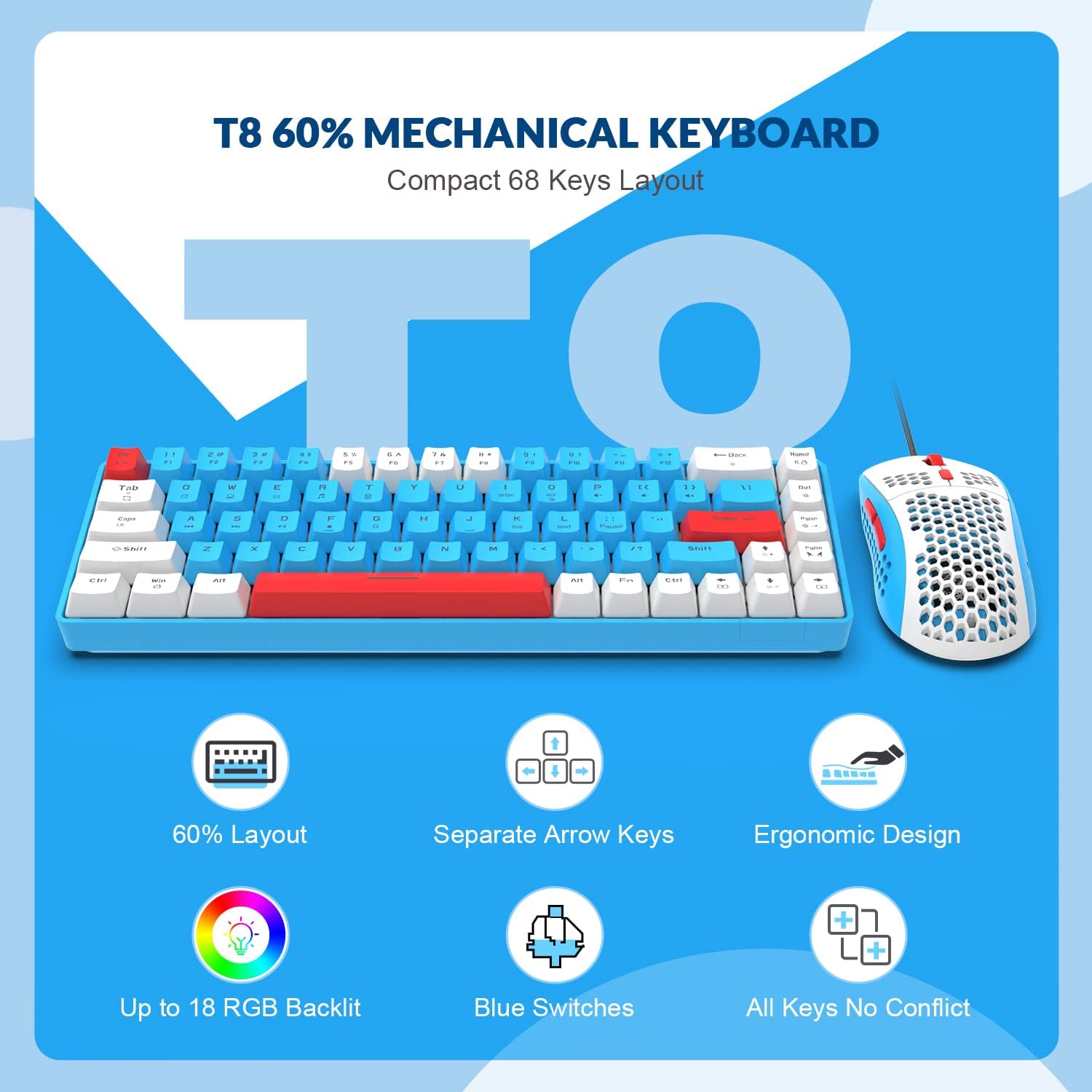 Комплект геймърска клавиатура и мишка Yindiao T8 60% RGB плюс спирален USB-C кабел, кабелна механична клавиатура, 68 клавиша, TKL компактно оформление, мишка със структура тип „пчелна пита“, до 6400DPI, за PC, MAC, PS5, син