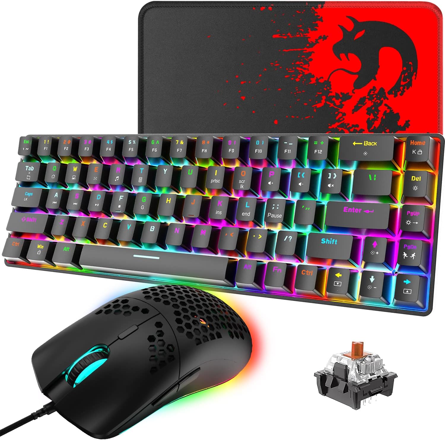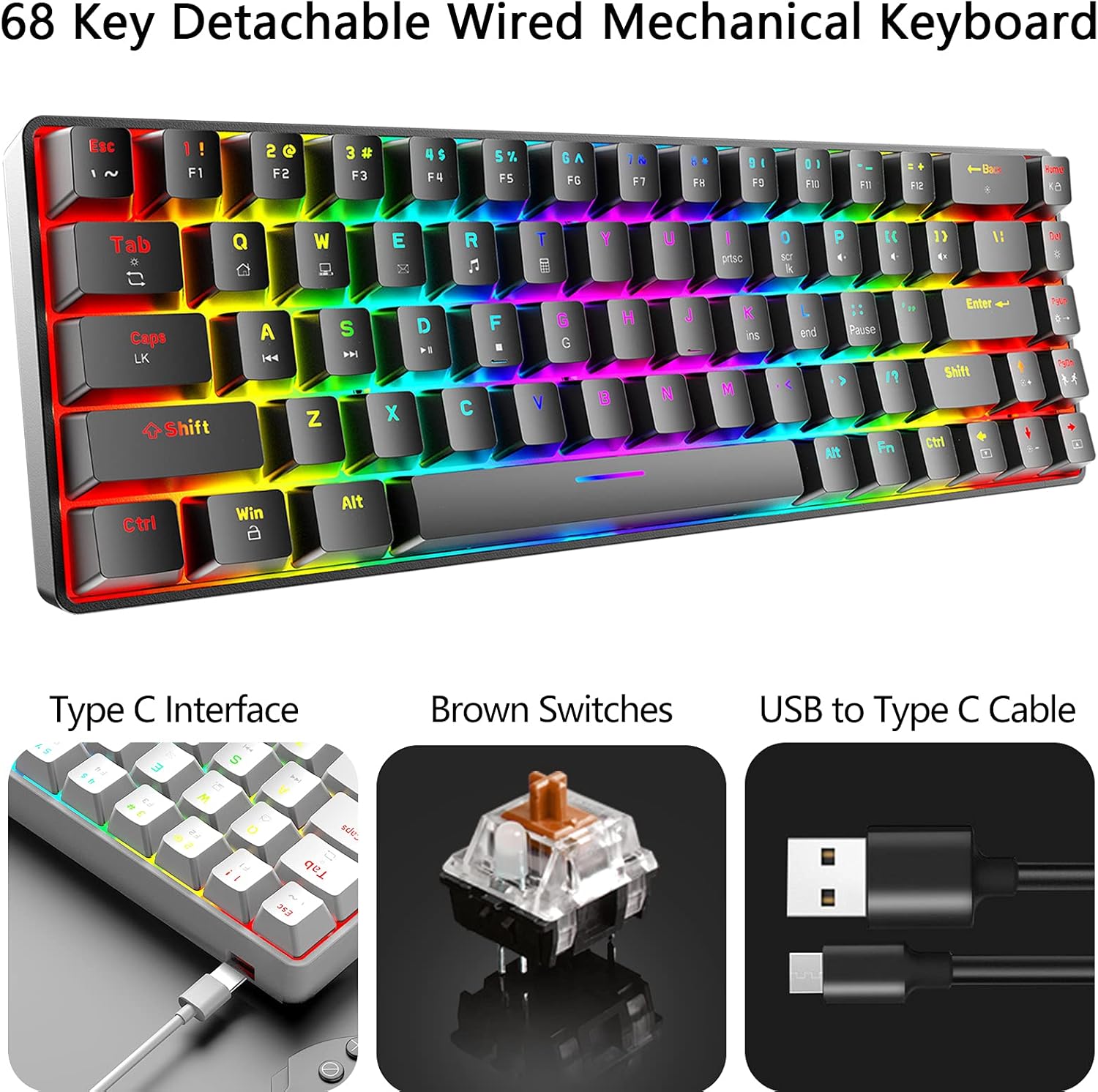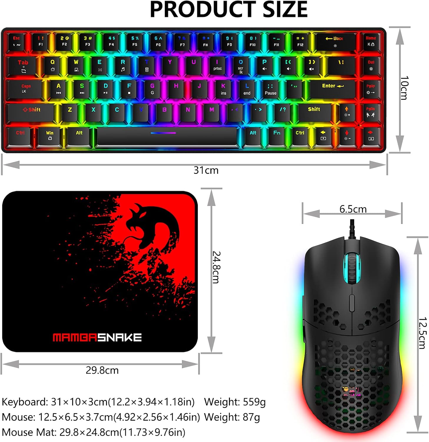 Комплект геймърска RGB клавиатура и мишка, 68 клавиша, кафяв превключвател, 60% мини Chroma механична клавиатура, 6400DPI лека оптична мишка тип „пчелна пита“, USB кабел, съвместима с Windows, Mac, PS4 XBox, черна