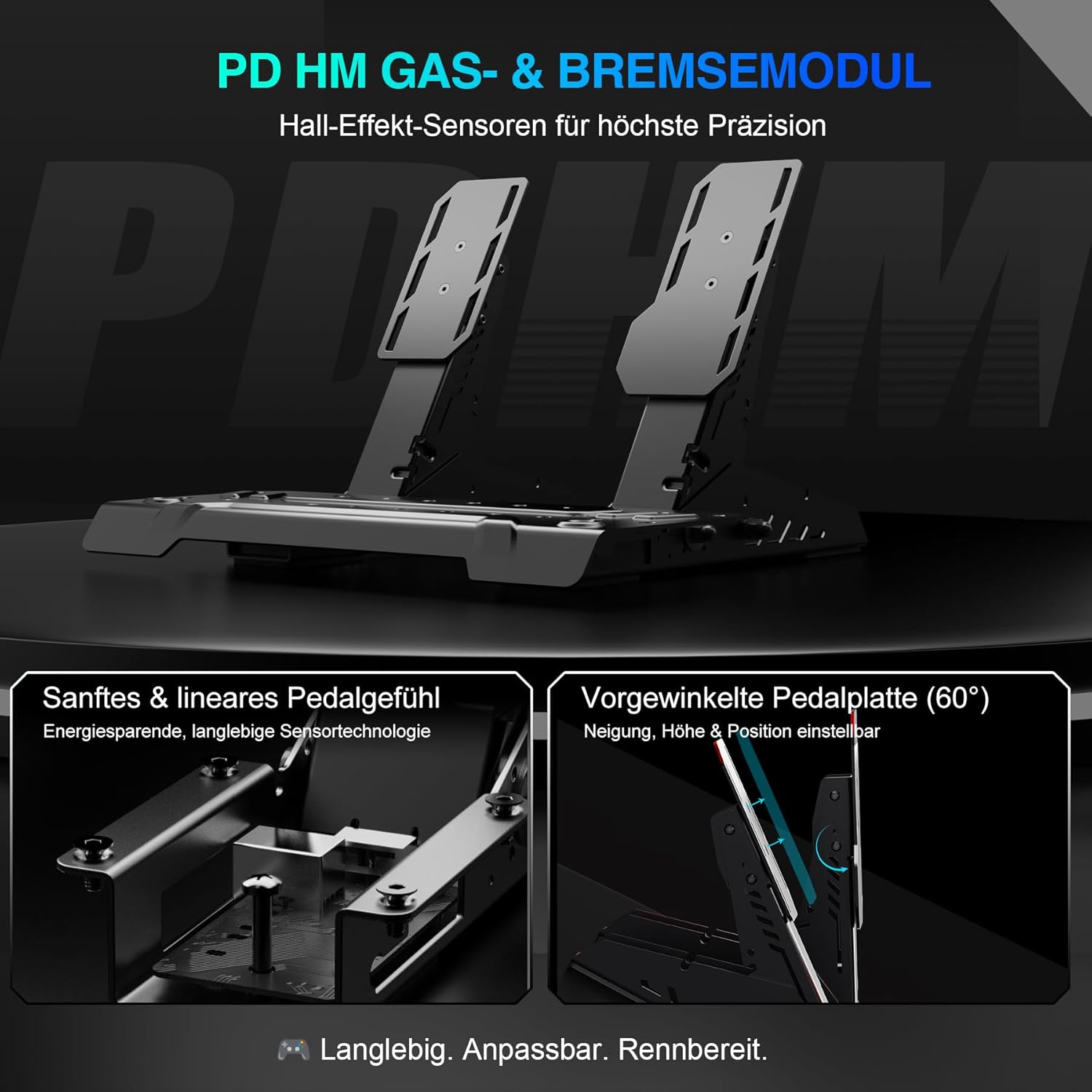 • PD HM Комплект от два педала - сензори на Хол и система за демпфиране - Изработени от издръжлива въглеродна стомана, с високопрецизни сензори на Хол в двата педала. Поддържа сменяеми демпфериращи елементи, както и регулируема височина и наклон на педалите. Модулният дизайн позволява лесен монтаж и поддръжка.