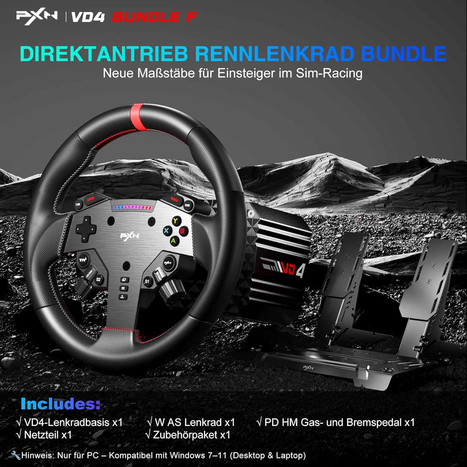 Комплект геймърски волан PXN VD4 ​​– Комплект състезателен волан с директно задвижване – 4 Nm VD4 серво мотор, W AS PC волан (28 см) и PD HM комплект педали за спирачка и газ – Sim Racing Set за PC