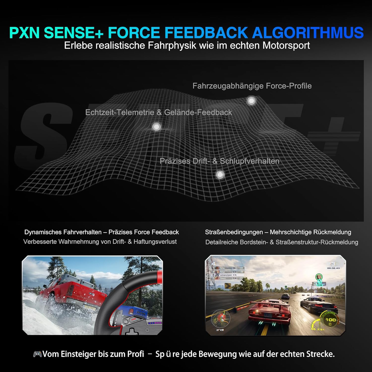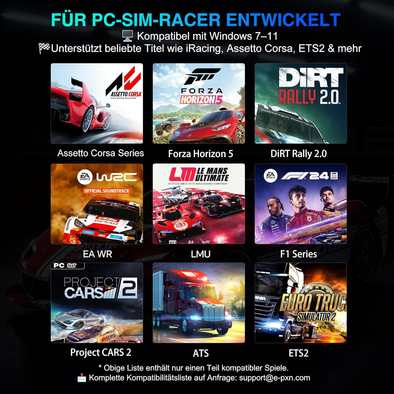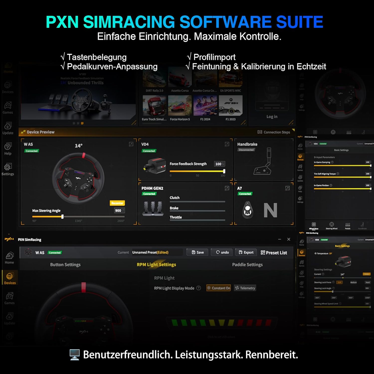 • Поддръжка от софтуера PXN SimRacing - Лесно конфигуриране с едно щракване на настройките на играта, като криви на обратна връзка за сила, LED ефекти и реакции на педалите. Позволява ви да запазвате и бързо да зареждате предварително зададени настройки и табла. Напълно съвместим с Windows компютри и популярни състезателни симулации като iRacing, Assetto Corsa, F1 и WRC 9.