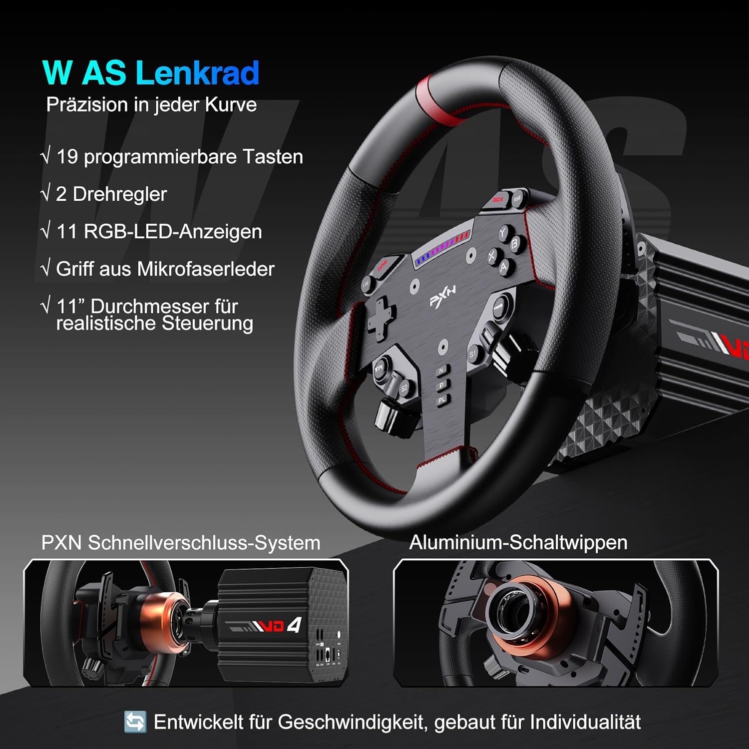 • Пълен комплект за лесно навлизане в света на симулаторните състезания с директно задвижване - Включва база PXN VD4 ​​​​с директно задвижване (4Nm въртящ момент), волан W AS (28 см, 19 програмируеми бутона, LED индикатор за скорост) и комплект от два педала PD HM (сензори на Хол, изцяло метална конструкция). Проектиран за подобряване на контрола и потапянето за ентусиастите на симулаторните състезания.