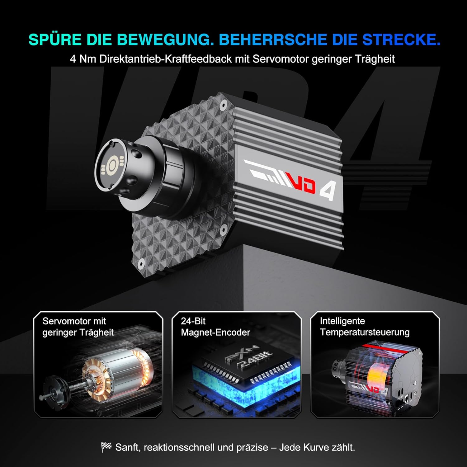 • VD4 Direct Drive Base - Високопрецизен серво мотор - Оборудван с модерен серво мотор, който елиминира ремъчното и зъбно предаване, което позволява особено стабилна и отзивчива обратна връзка по силата. Поддържа включване/изключване с един бутон, както и множество опции за разширение - по-мощен от традиционните конструкции на мотори.