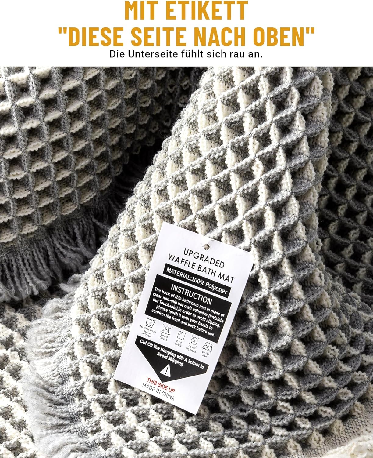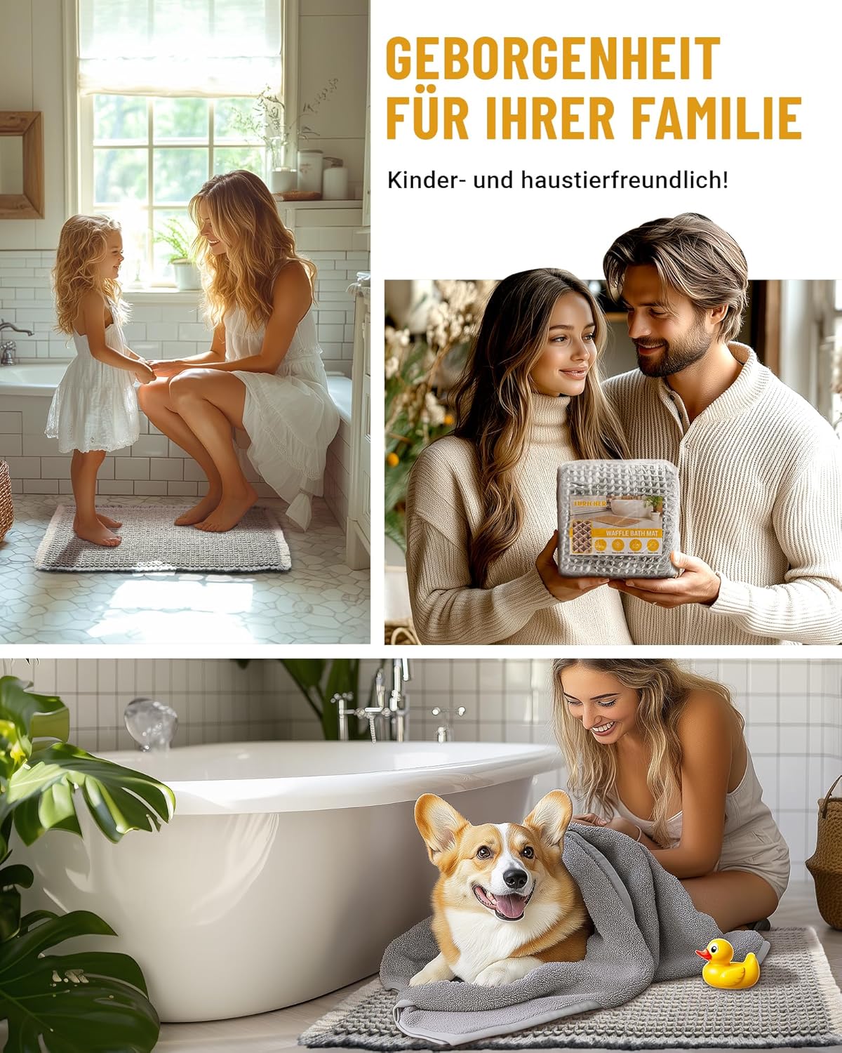 • Приятна вафлена текстура: постелката за баня Furicher изненадва с 3D вафлена шарка – като гигантско вафлено тесто. Меката повърхност глези уморените крака и надеждно предпазва от студени подове.
