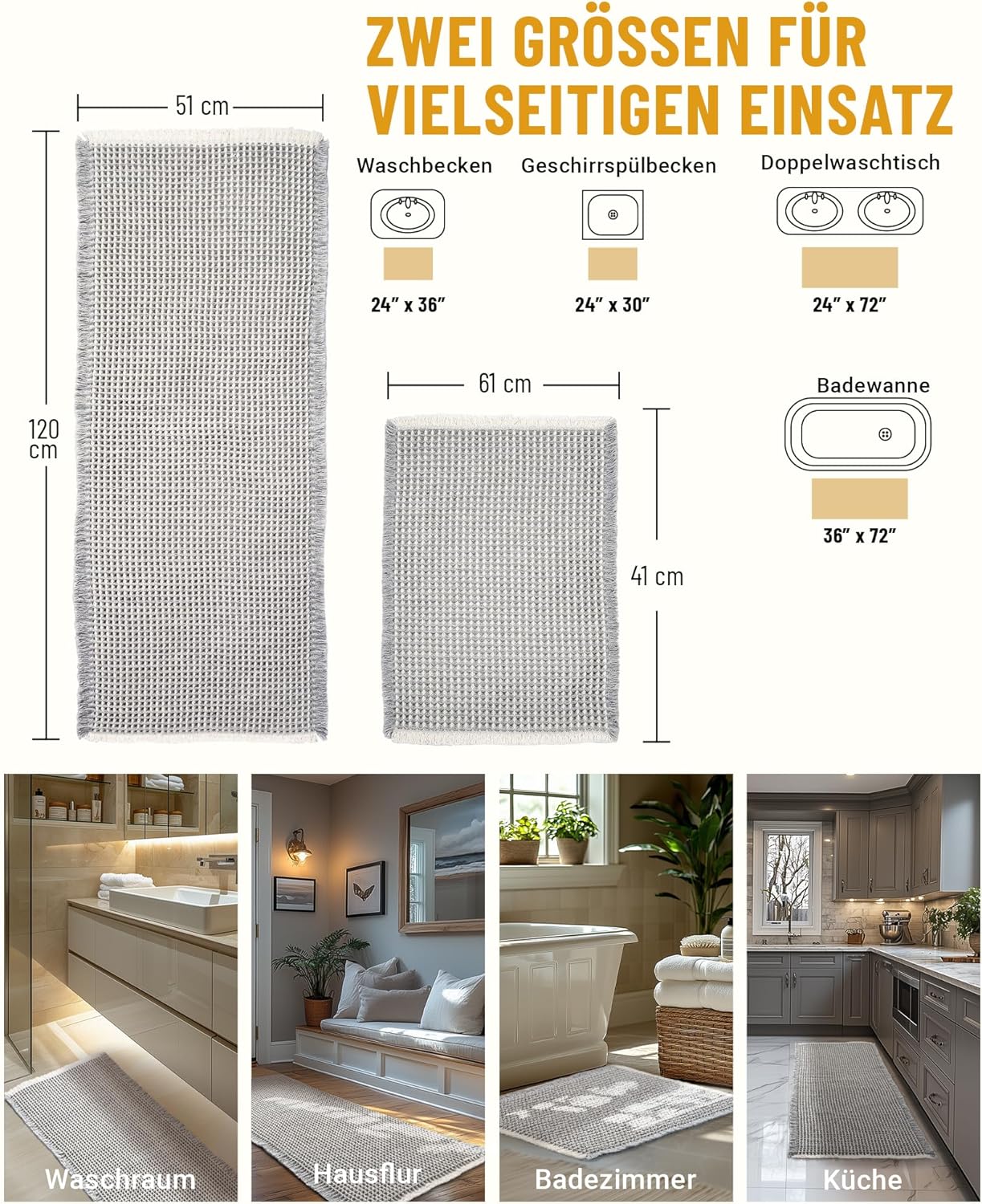 • Двойно дизайнерско щастие: бохемският стил среща ежедневието: като декоративен акцент в банята или като подарък за удоволствие. Комплект от два килима: голяма постелка за баня (51 x 120 см) + практична изтривалка за врата (41 x 61 см). Може да се комбинира за всякакви ситуации в стаята.