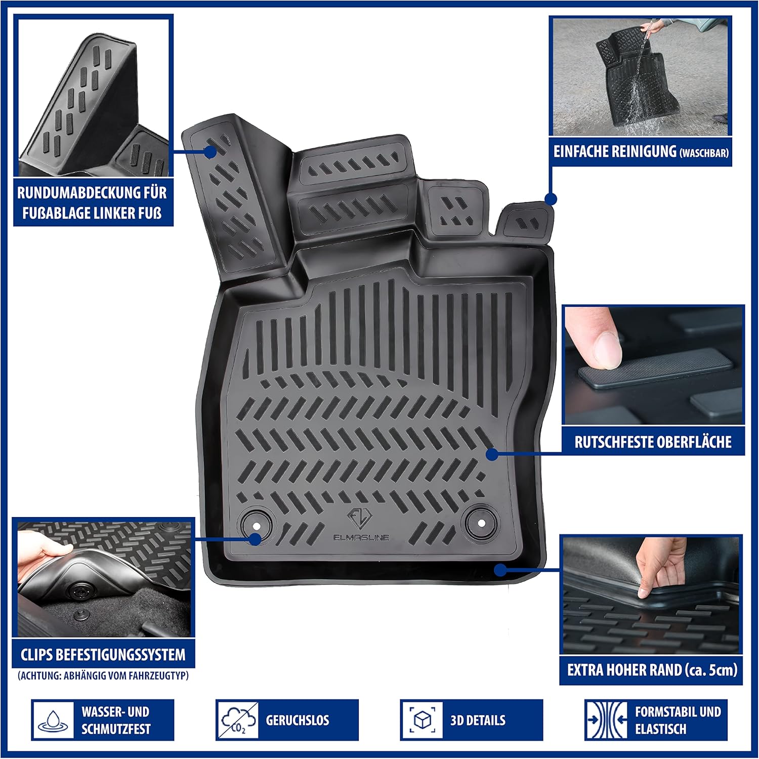 Изключително високият 3D ръб на автомобилните стелки ELMASLINE осигурява трайна и надеждна защита на интериора на автомобила от течности и замърсявания. В зависимост от модела на автомобила, ръбът е с височина приблизително 3-5 см.