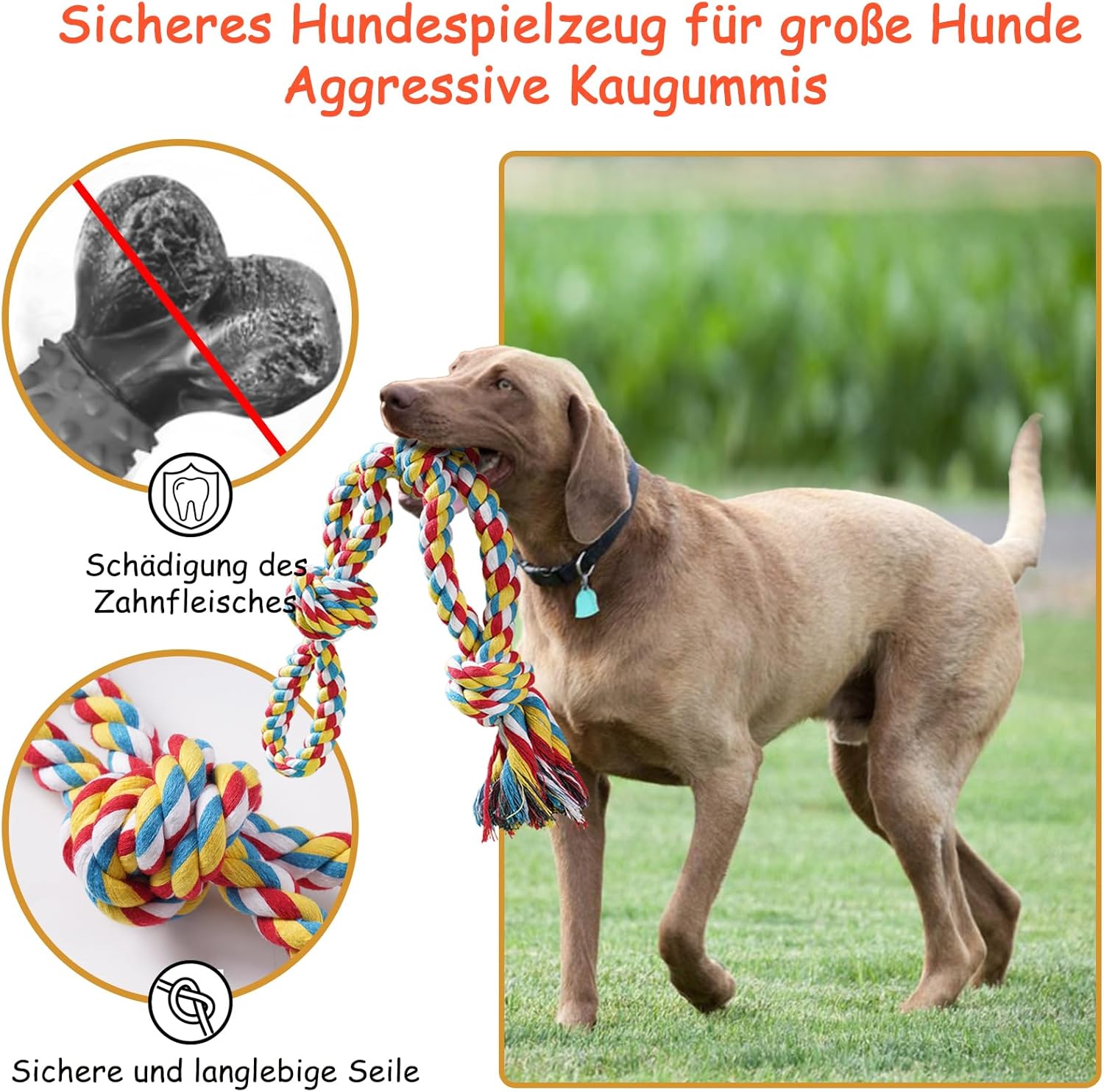 • Здрава играчка за дъвчене и почистване на зъби за кучета - Изключително голямата играчка за кучета с въже е идеална за дъвчене и игра за кучета. Когато дъвчат тази играчка с въже, вашите кучета могат да си почистват зъбите. Страхотен забавен и ефективен начин за почистване на зъби.