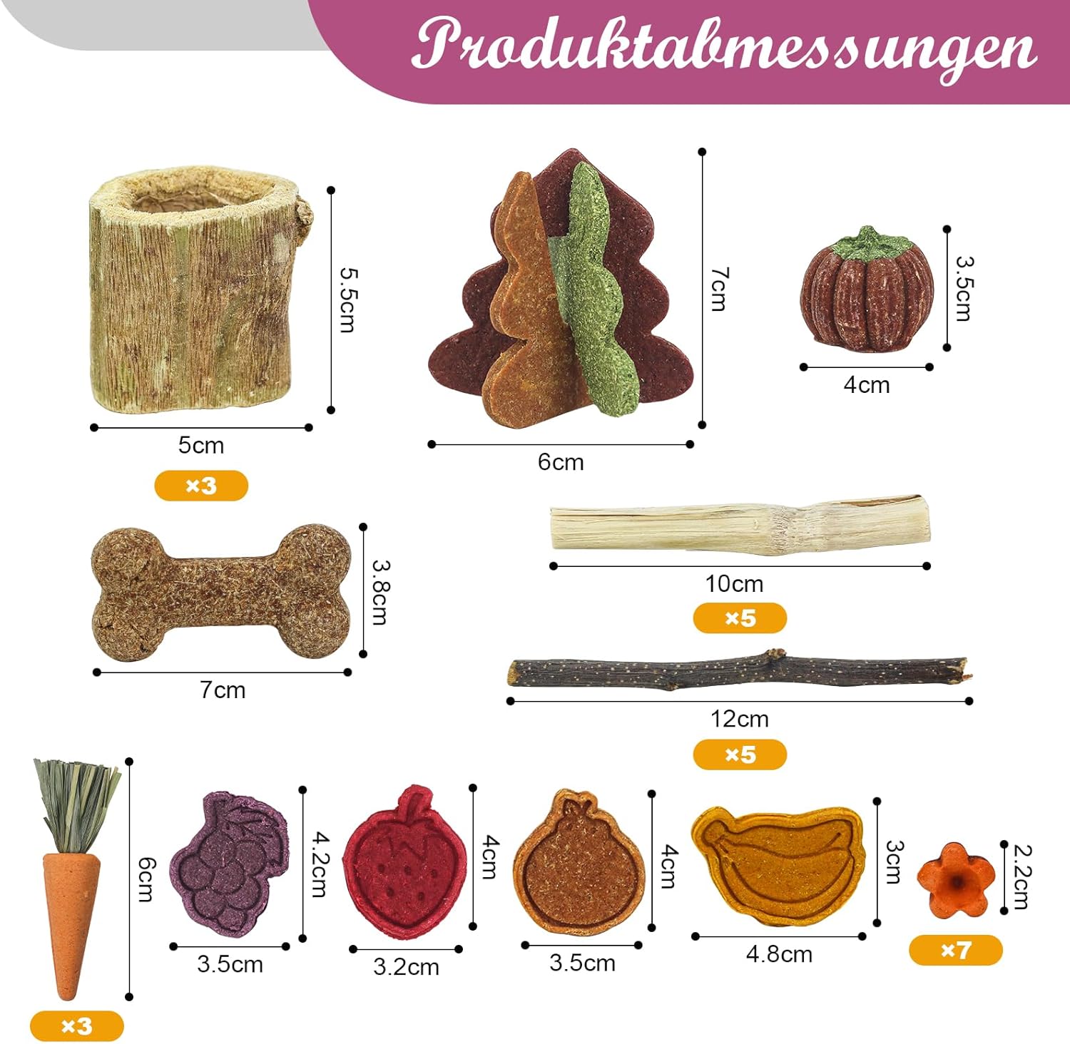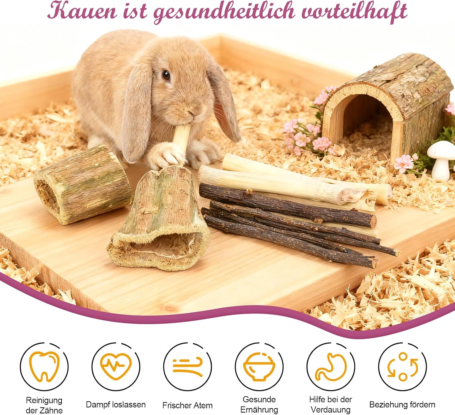 ●Нашите дъвчащи пръчици за домашни любимци са внимателно разработени, за да отговорят на нуждите от дъвчене на малки домашни любимци, като зайци, хамстери и чинчили. Продуктът използва естествена ябълкова дървесина и тимотейка, без добавяне на изкуствени химикали, за да гарантира здравето и безопасността на домашните любимци по време на процеса на дъвчене.