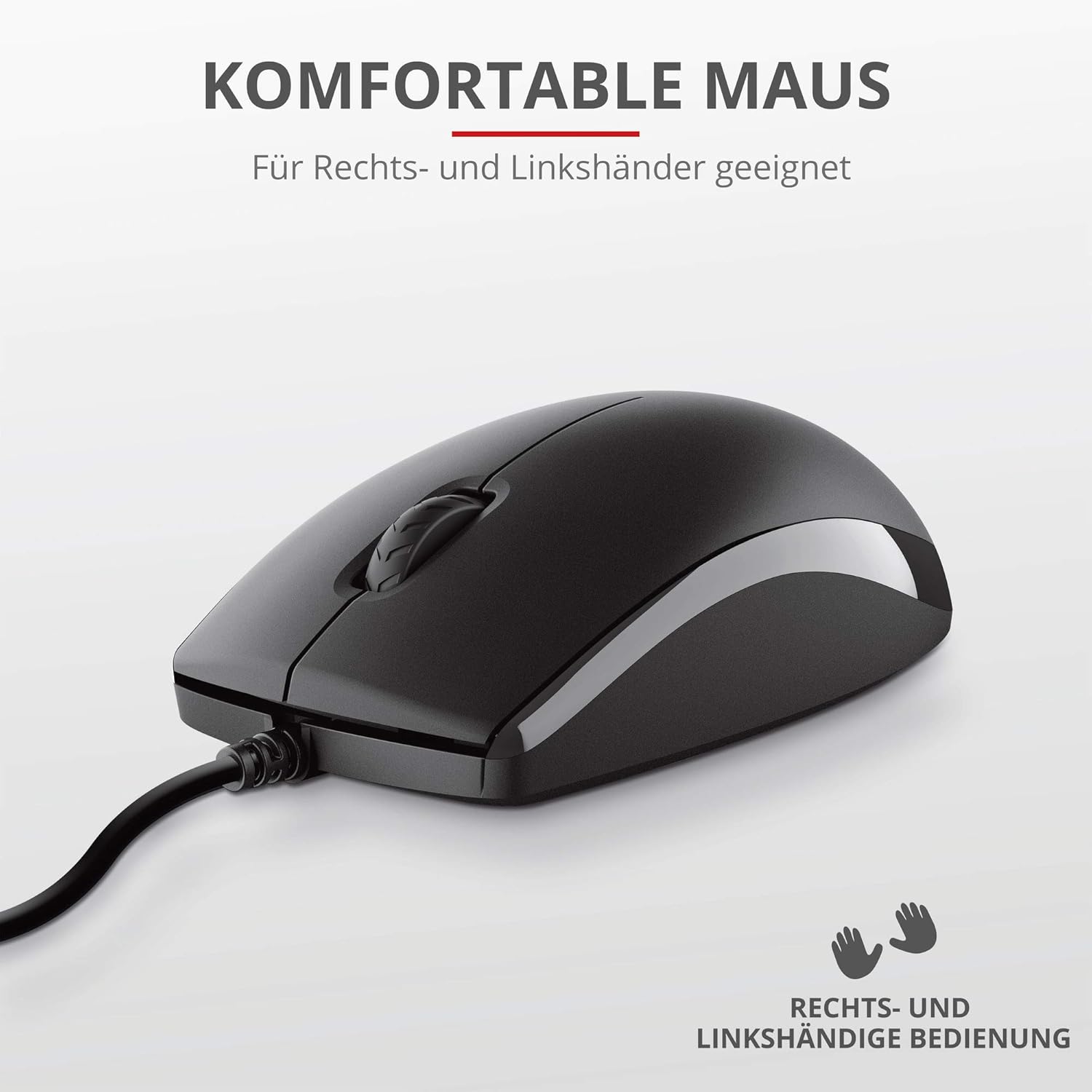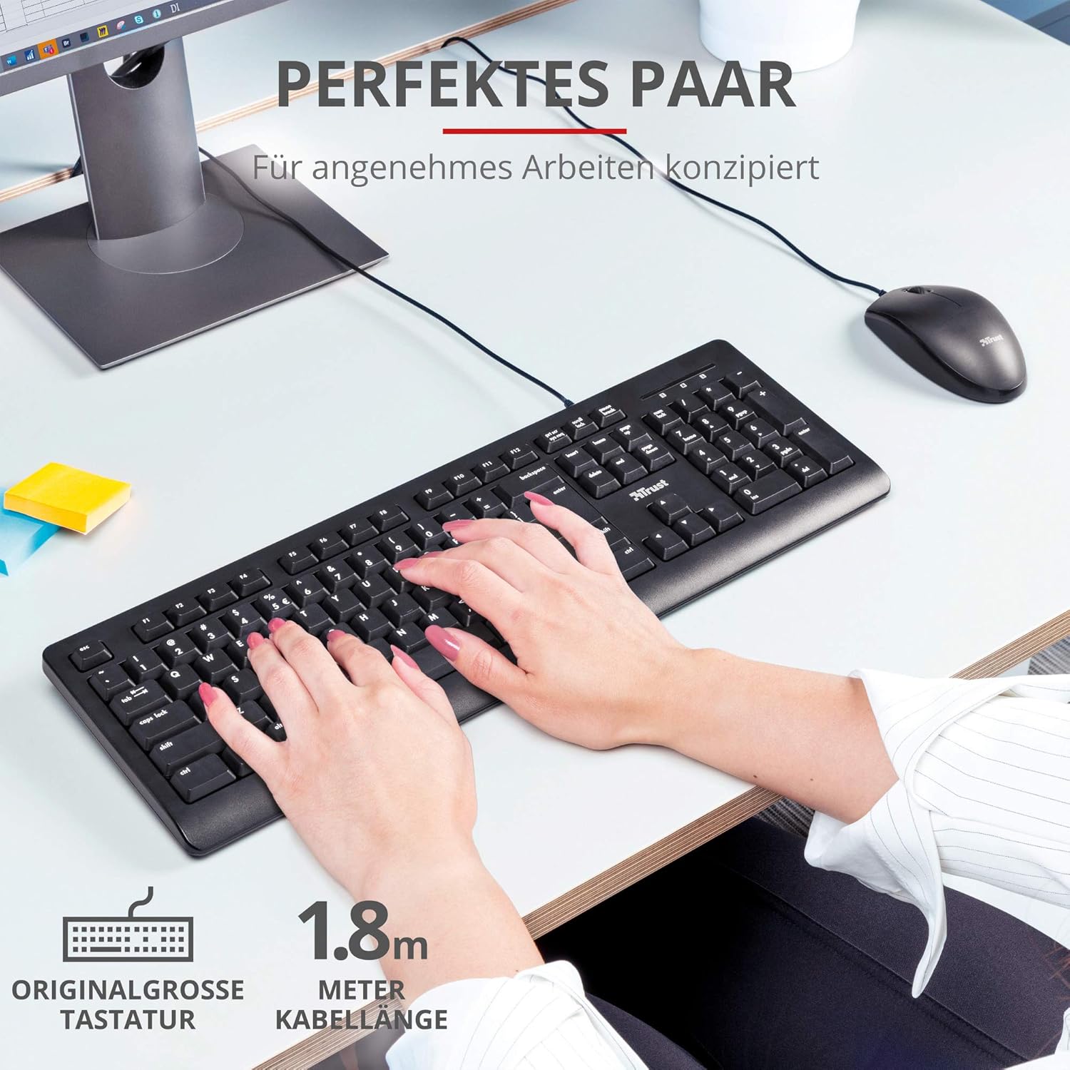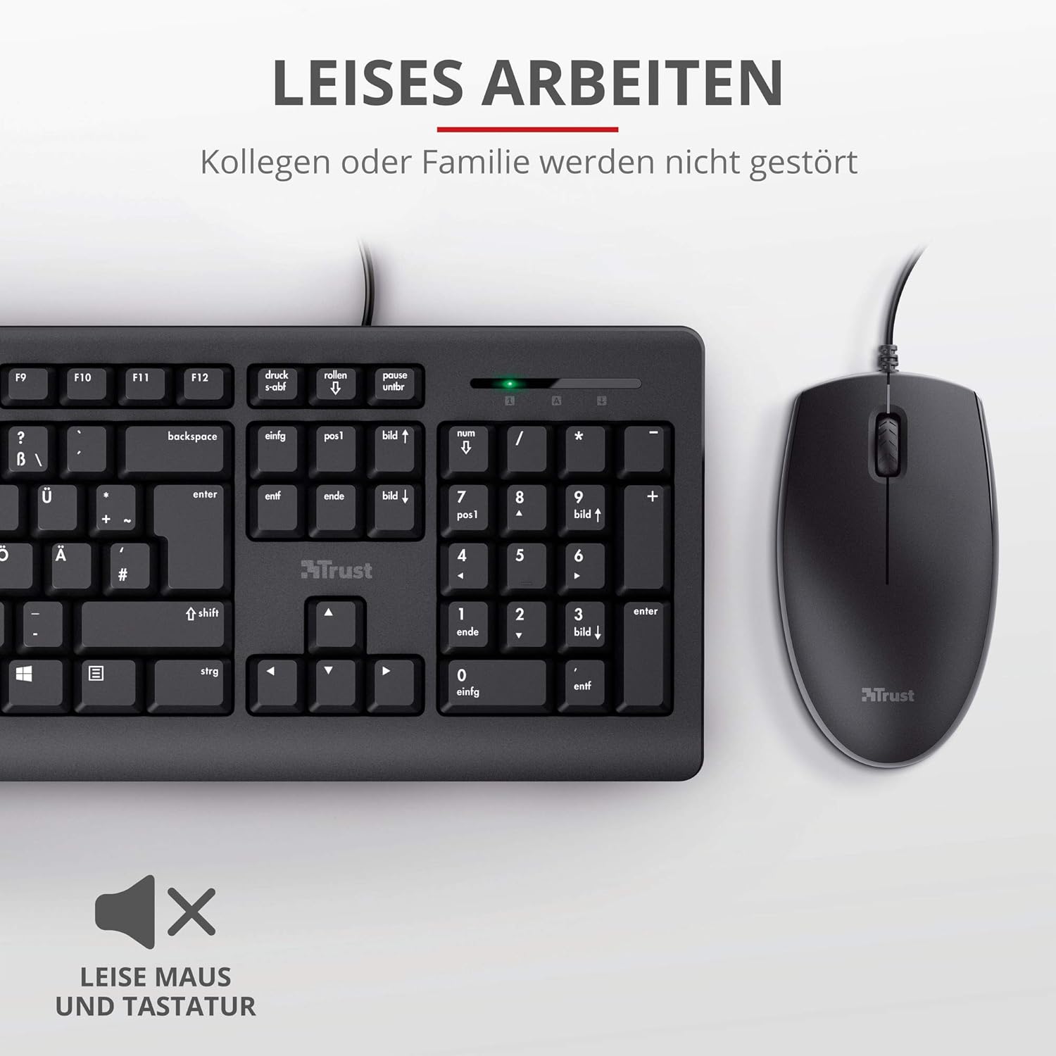 Комплект кабелна клавиатура и мишка Trust Taro, немска QWERTZ подредба, тихи клавиши и бутони на мишката, водоустойчива, USB порт, за компютър, лаптоп, MacBook, Windows, MacOS - черен