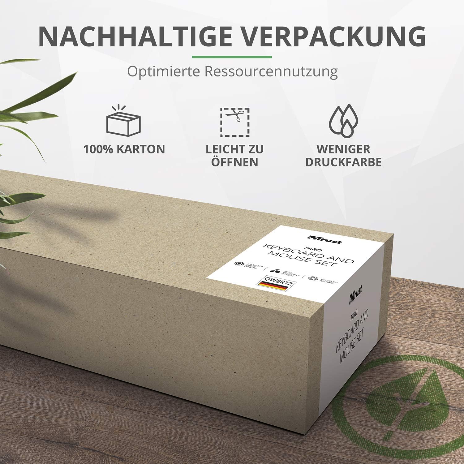 • НЕМСКА РАЗДЕЛКА – Комплектът тиха клавиатура и мишка Trust Taro разполага с пълноразмерна QWERTZ подредба и цифрова клавиатура за максимална производителност.