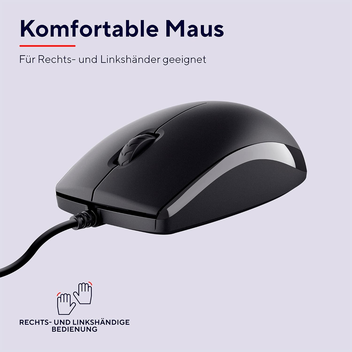 Комплект кабелна клавиатура и мишка Trust Taro, немска QWERTZ подредба, тихи клавиши и бутони на мишката, защита от пръски, USB връзка, за компютър, лаптоп, MacBook, Windows, macOS - черен