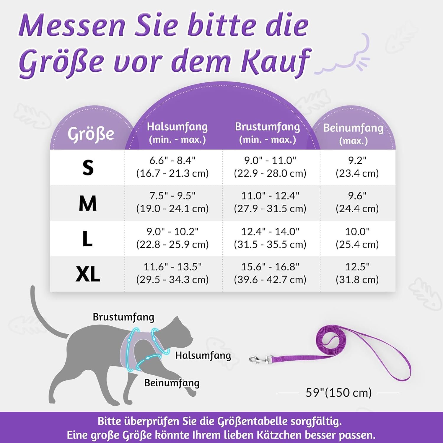 ПАСВА ПЕРФЕКТНО ЗА ВРАТА 17-21 СМ ГЪРДЕН КРЪГ 23-28 СМ Моля, измерете точно котката си и внимателно изберете нагръдник според таблицата с размери. За по-добро прилягане на вашето очарователно котенце се препоръчва да изберете по-голям размер. Комплектът включва: 1 x нагръдник за котки и 1 x найлонова каишка (149,9 см). Създаден за комфорт и функционалност, дизайнът на жилетката прави този нагръдник лесен за поставяне и сваляне. А регулируемата каишка създава перфектно прилягане за вашата котка с известно пространство за растеж. (Съвети: моля, дайте на котката си известно време да се запознае с този нагръдник за първи път)