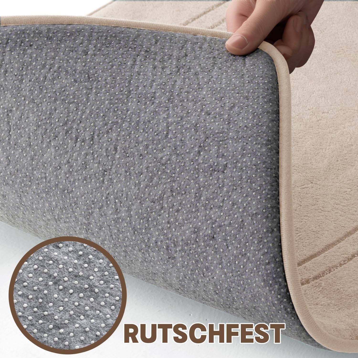 • Неплъзгаща се постелка за баня: Неплъзгащата се долна страна на постелката за баня е изработена от висококачествен нетъкан текстил чрез точково формоване. Тази неплъзгаща се подложка осигурява почти пълна устойчивост на хлъзгане по повърхността на плочките на пода, така че няма да се подхлъзне или изплъзне, за да се увеличи вашата безопасност. Долната част на тази постелка за баня е по-здрава и издръжлива, не се износва и отлепва лесно и може да се използва дълго време.