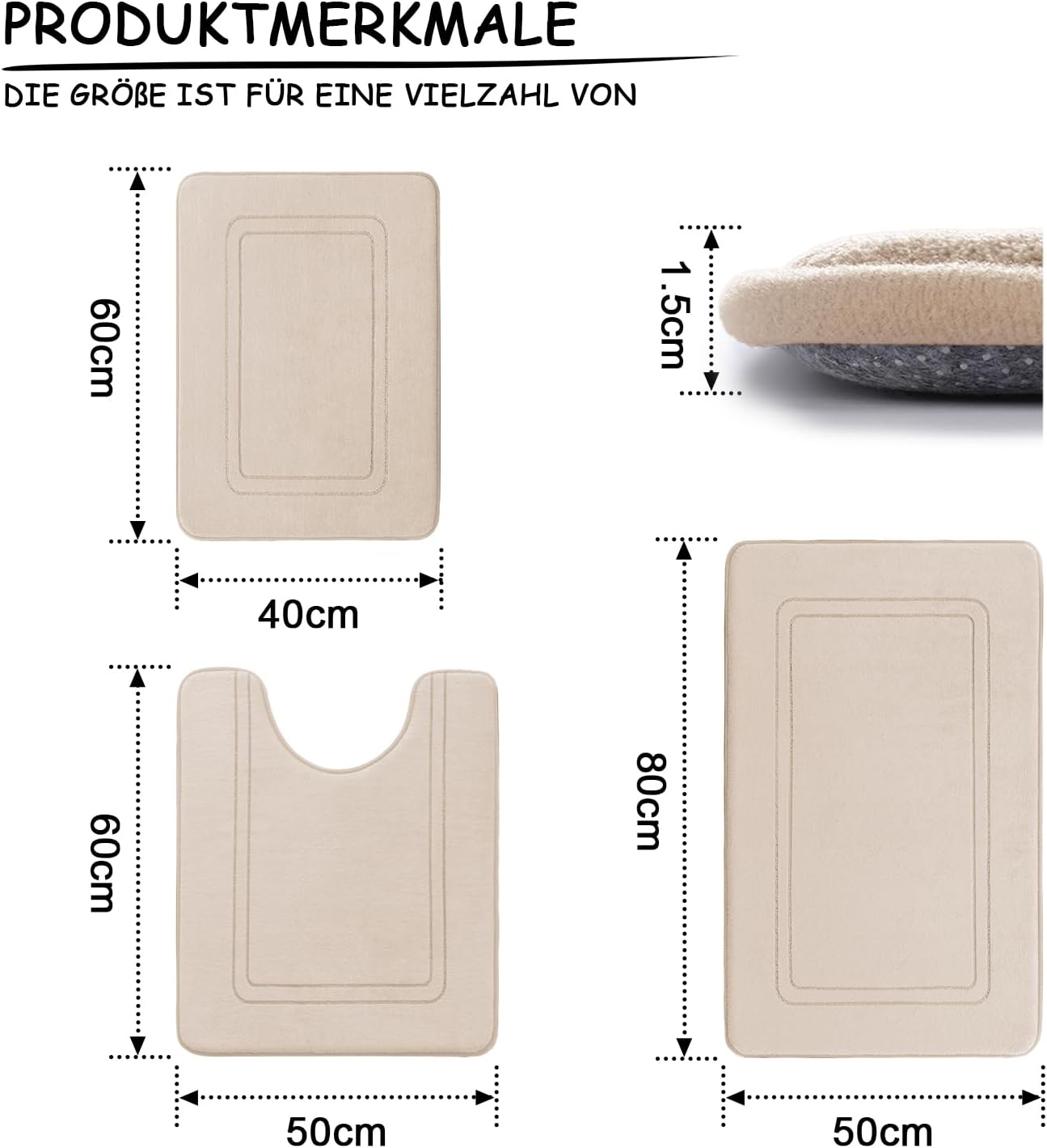 Комплект килими за баня Chakme, 3 части, мека постелка за баня от мемори пяна и U-образна постелка за тоалетна, постелка за баня, комплект неплъзгащи се постелки за баня, бежов