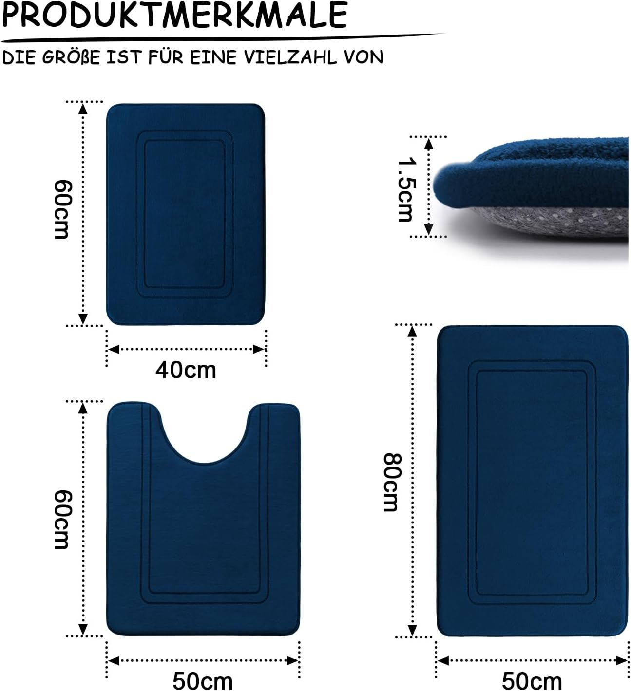 Комплект килими за баня chakme, 3 части, мека постелка за баня от мемори пяна и U-образна постелка за тоалетна, постелка за баня, комплект неплъзгащи се постелки за баня, тъмносиньо