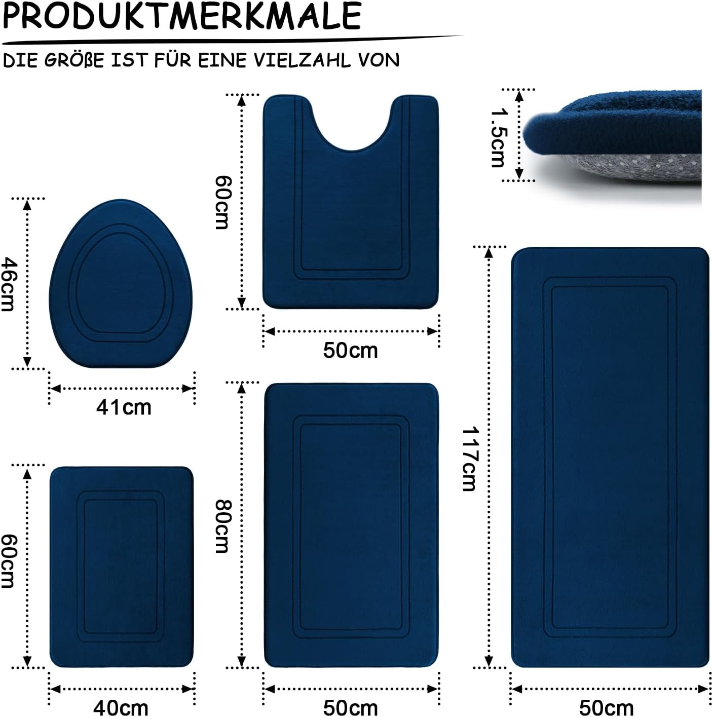 Комплект килими за баня chakme, постелка за баня, комплект неплъзгащи се постелки за баня, 5 части, мека постелка за баня от мемори пяна и U-образна постелка за тоалетна, тъмносиньо