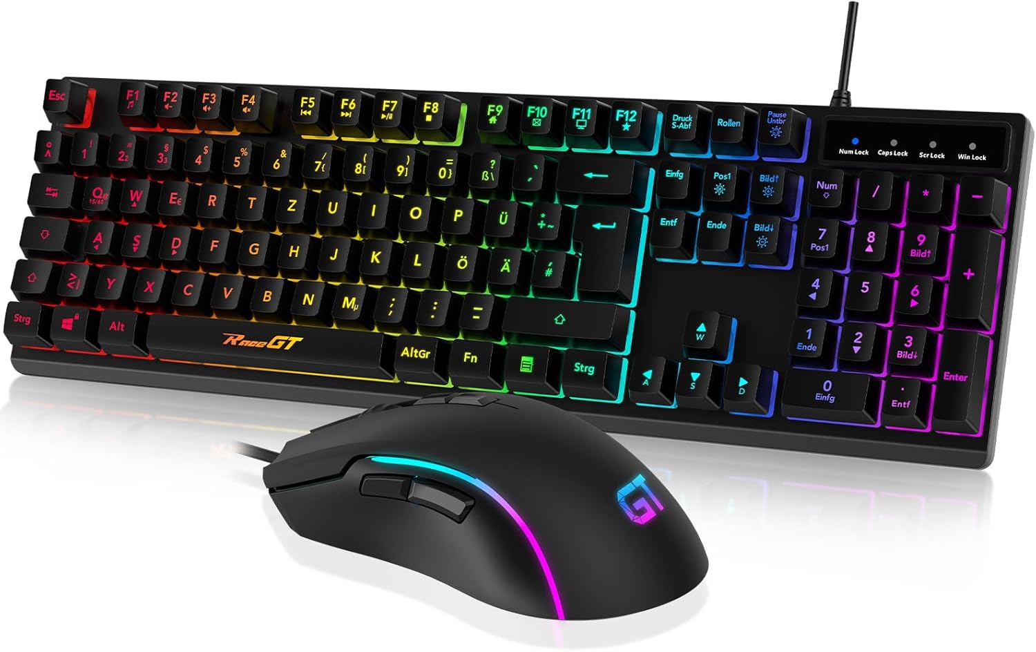 • ⌨ RGB подсветка на геймърската клавиатура: Кабелната 100% геймърска клавиатура предлага завладяващо гейминг изживяване с регулируема яркост, която да отговаря на вашите нужди. 104 клавиша в пълен размер, с немска подредба с F-клавиши (функционални клавиши) и цифров блок. Регулируемите стойки предлагат на ръцете ви по-удобна позиция за игра, намалявайки умората им.
