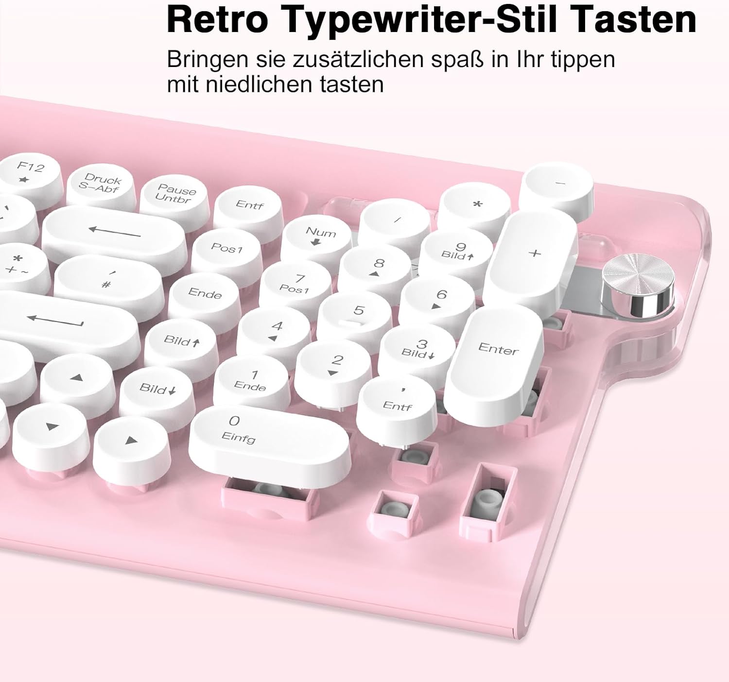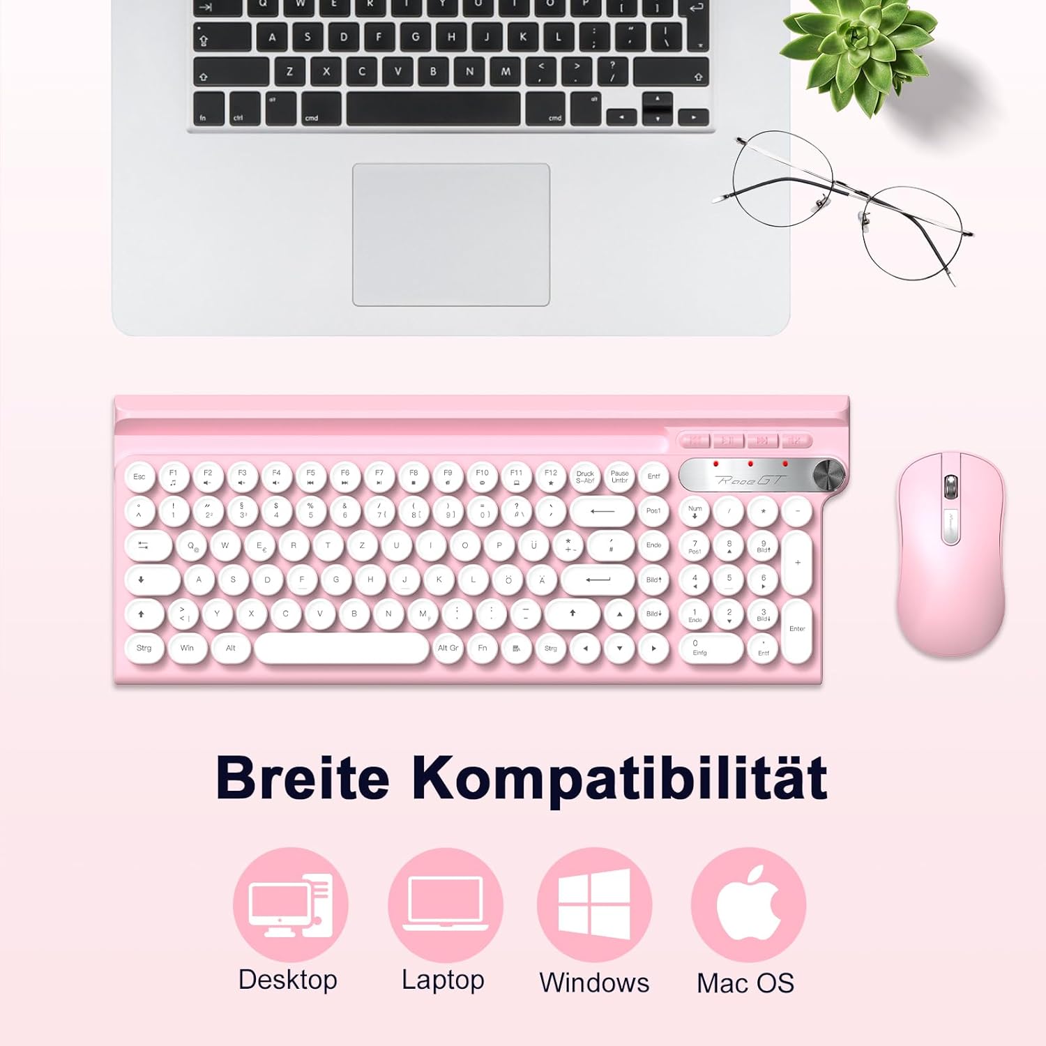 Комплект клавиатура и мишка безжична 2.4G, RaceGT пишеща машина с кръгли бутони, розова, поставка за мобилен телефон и таблет, копче за сила на звука, цифрова клавиатура, захранвана от батерия и енергоспестяваща, QWERTZ немска подредба