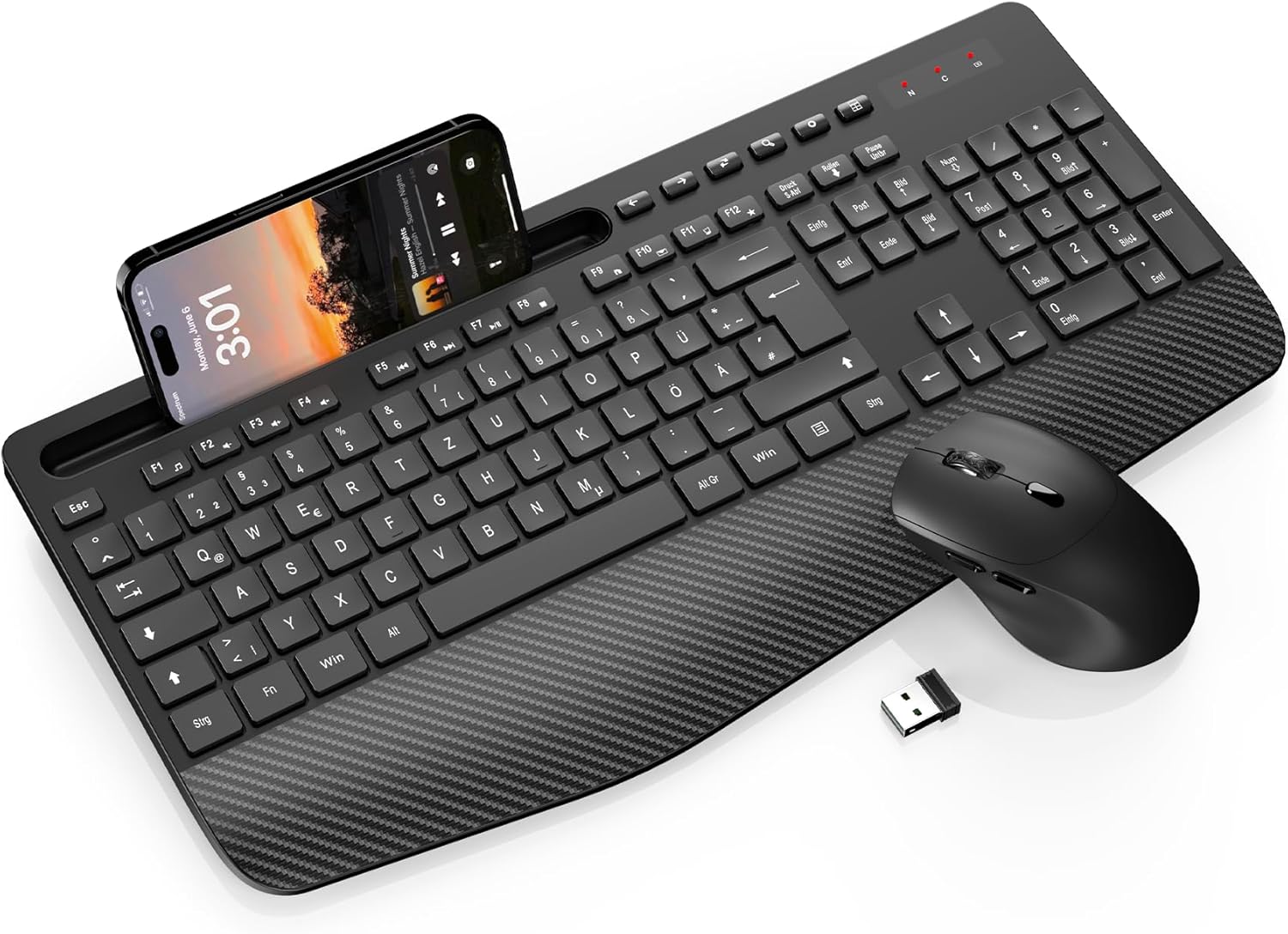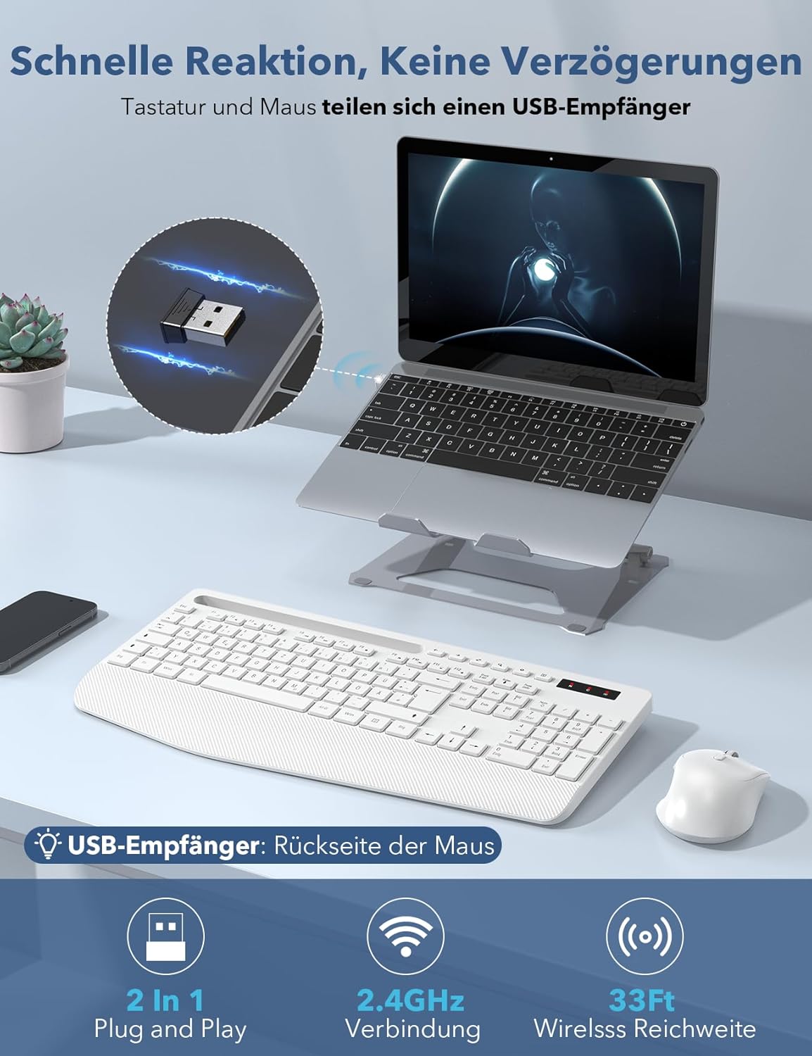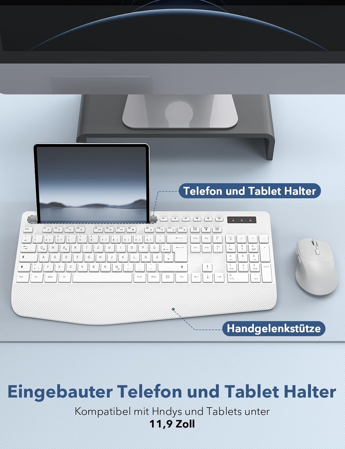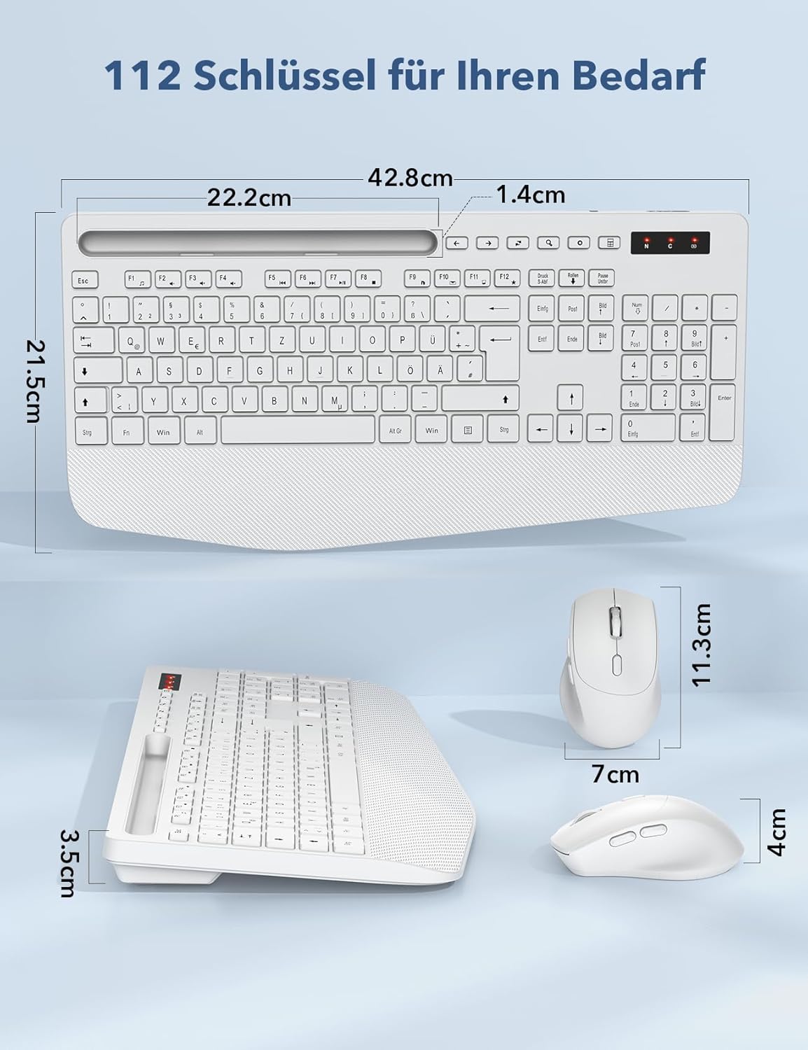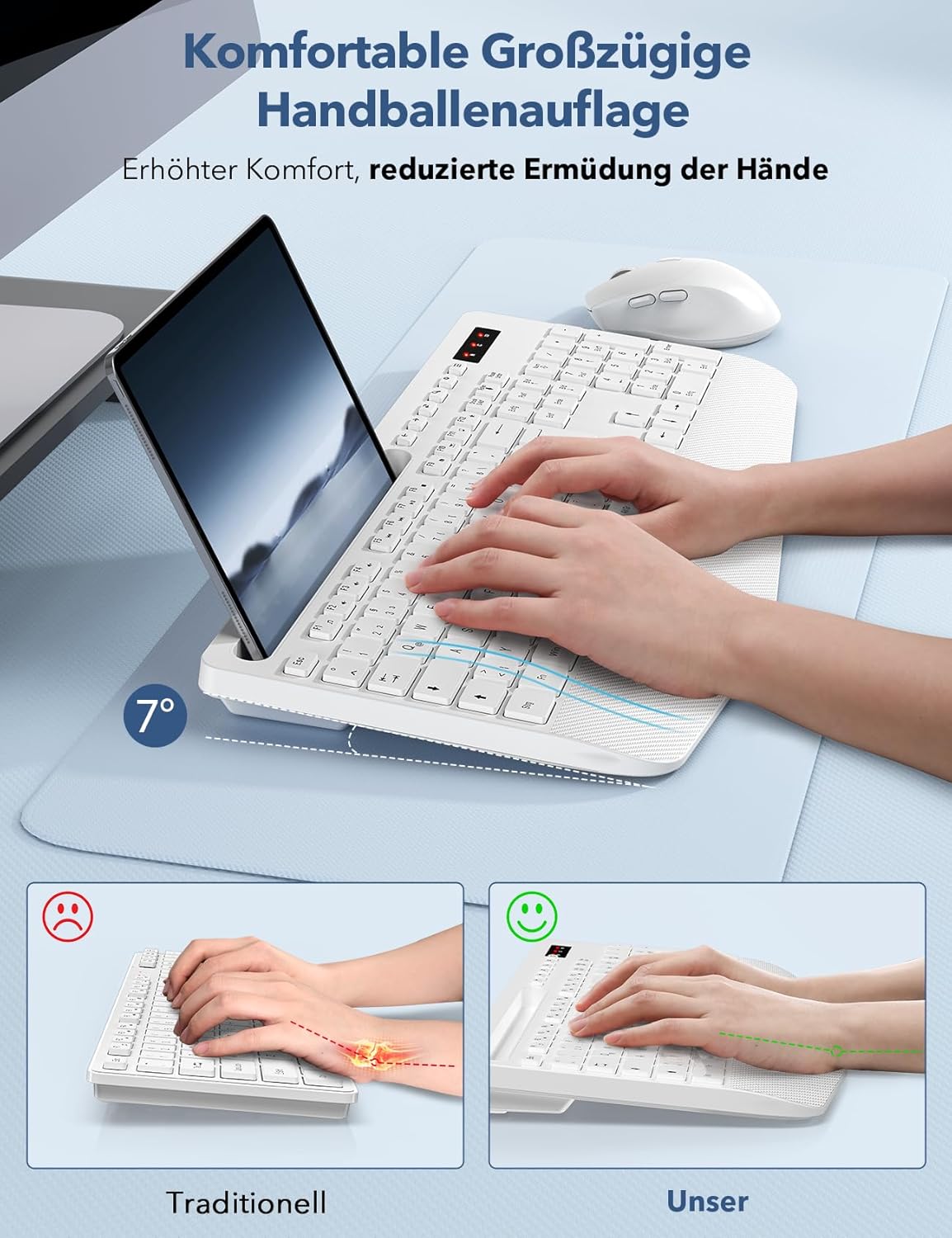 • 【СЪЗДАДЕНА ЗА КОМФОРТ】 - Ергономична клавиатура с щедра опора за длани и накланящи се крачета за по-добра позиция при писане, за да се намали натиска върху китката. Безжичната мишка предлага абсолютен комфорт с ъгъл на ръкостискане, контурирани дръжки и висококачествено матово покритие. 【ЗАБЕЛЕЖКА:】Клавиатурата няма Bluetooth функционалност.