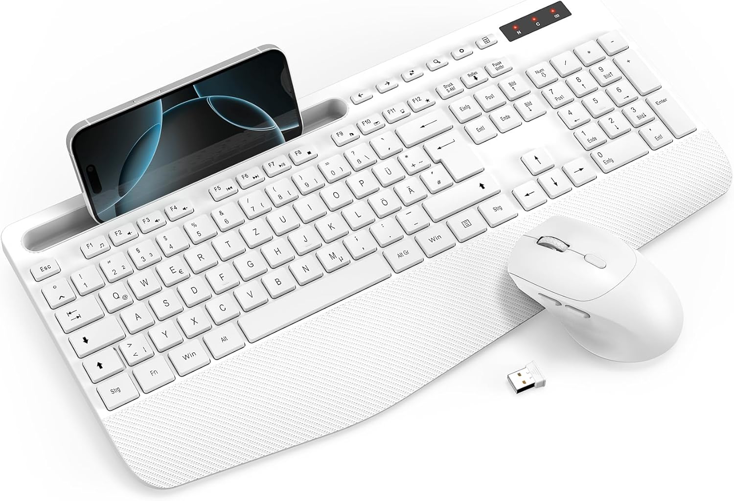 Комплект клавиатура и мишка безжична, ергономична клавиатура с пълен размер с поставка за китката, държач за телефон, режим на заспиване, тиха 2.4 GHz безжична клавиатура и мишка за Windows, компютър, лаптоп, PC - бяла