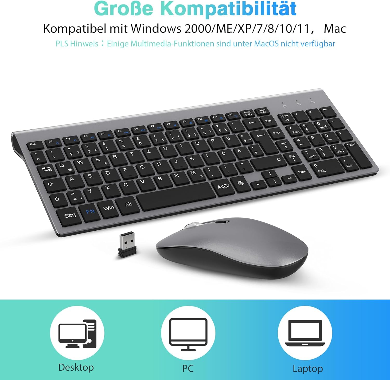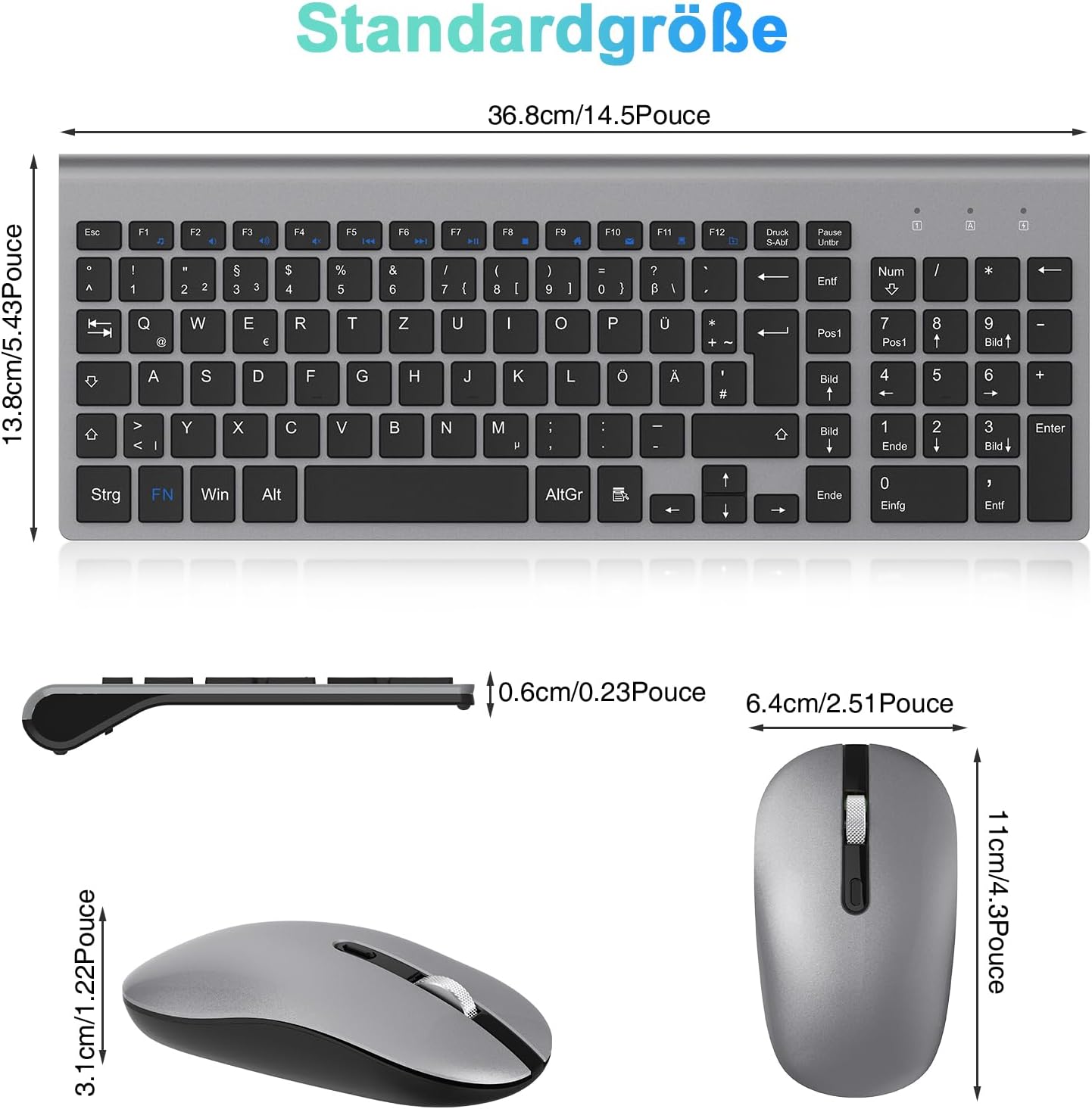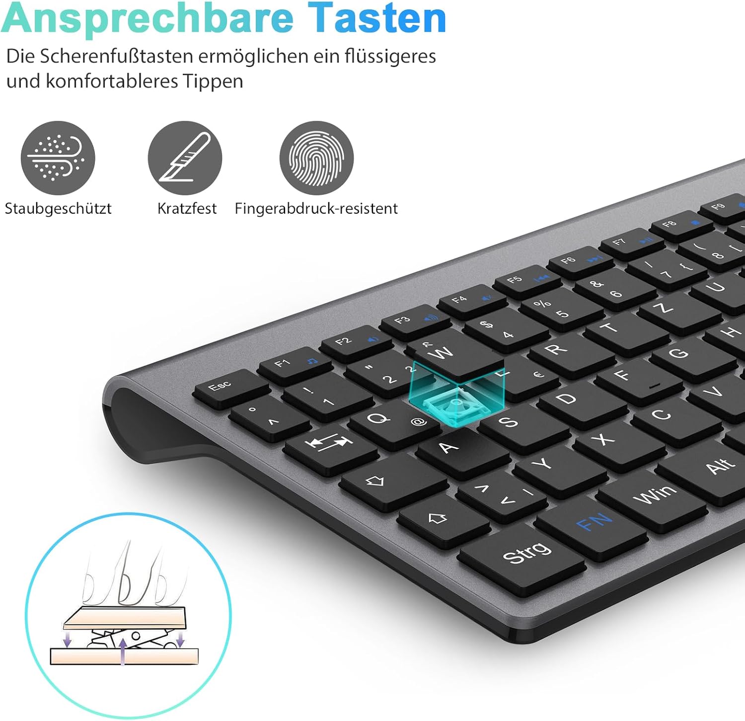• 【Безжична клавиатура с QWERTZ оформление】Немската клавиатура с DE QWERTZ оформление и функционалните клавиши Fn ви позволява директно да използвате 12 мултимедийни клавиша за регулиране на силата на звука, достъп до началната страница, копиране, поставяне, изрязване и др. Тънкият дизайн на безжичната клавиатура (14,5 x 5,3 x 0,23 инча) (ход на клавишите 2 мм) гарантира, че тя може лесно да се пъхне в раница или чанта за лаптоп.