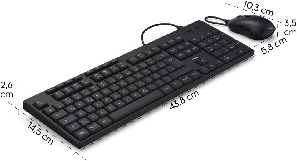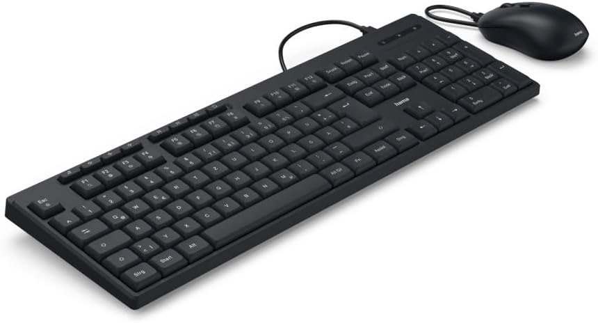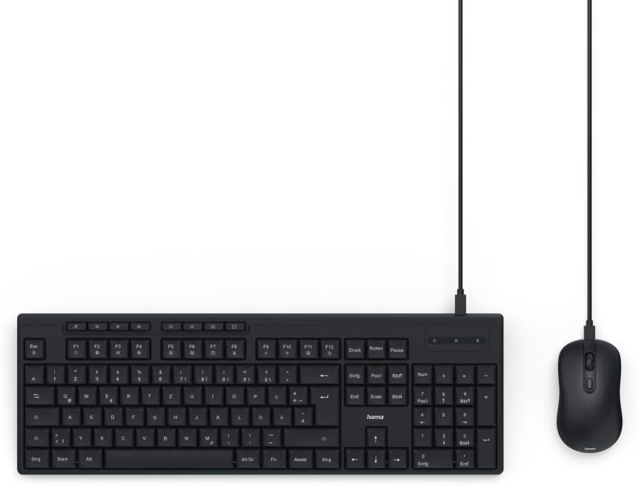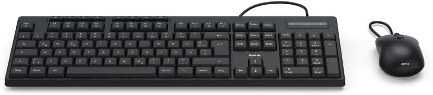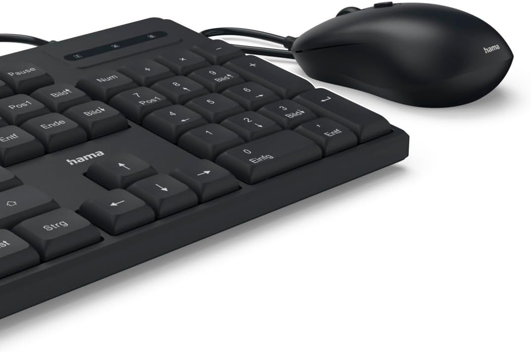 Комплект клавиатура и мишка Hama CKM-200 (USB клавиатура, USB мишка, ергономично усещане за писане, тихи клавиши, подвижен кабел, немска QWERTZ подредба, мишка с DPI превключвател, мултимедийни клавиши) Черен