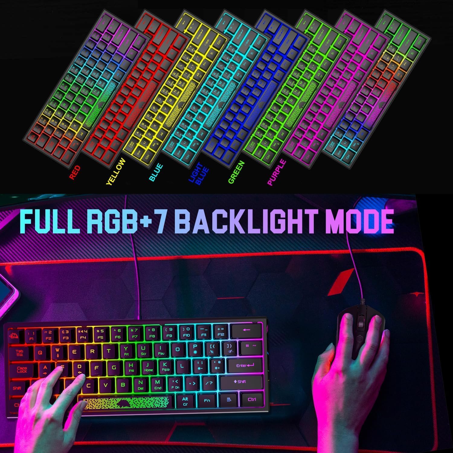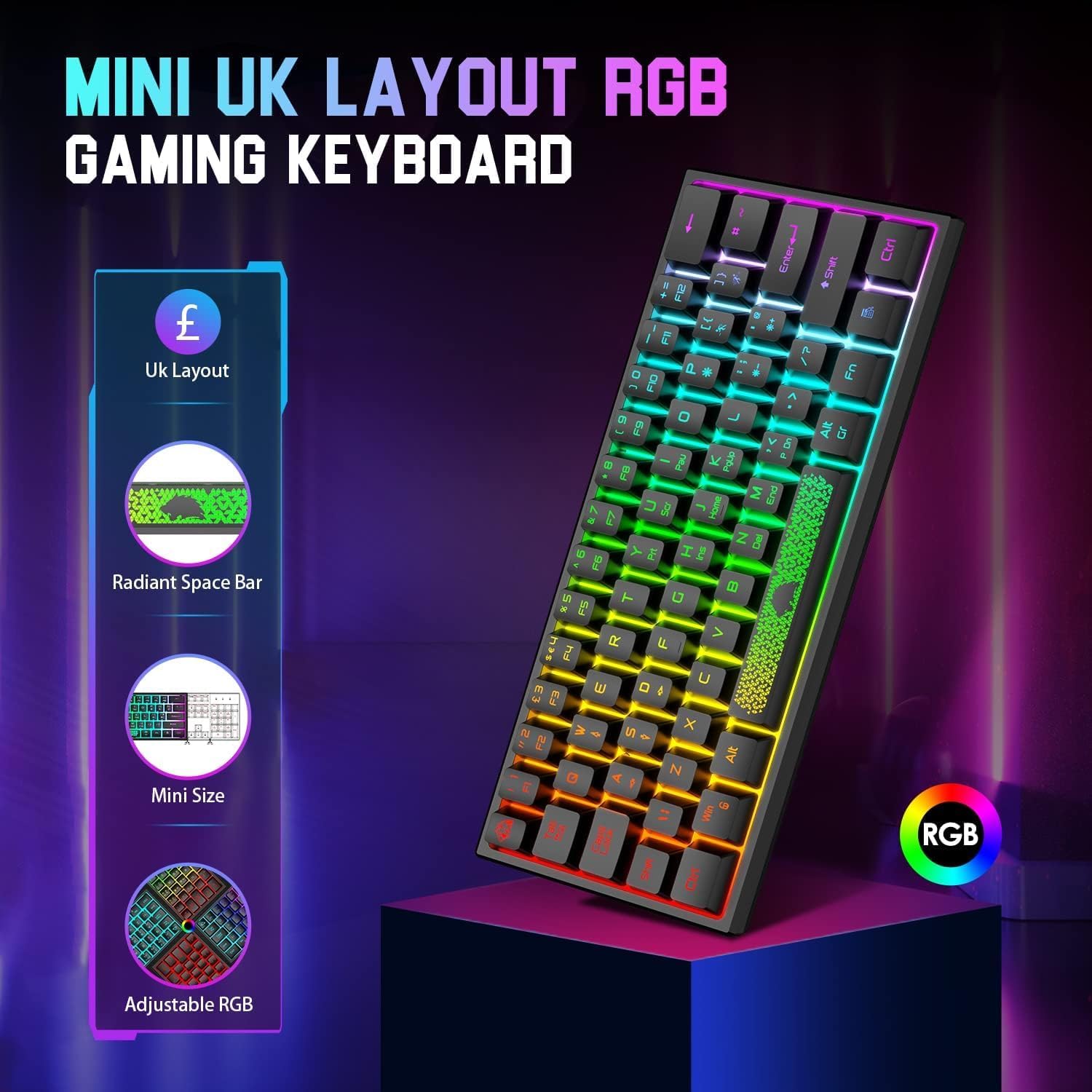 • ️ МИНИ RGB КЛАВИАТУРА С UK ПОДГЛАВКА Това е класическа клавиатура с 62 клавиша с UK подредба, която компресира всички функции в клавиатурата, компактна и достатъчно малка, за да спести място. Просто сменете RGB режима с FN + P; светещият интервал е друга стопляща сърцето тема, персонализирайте клавиатурата си. Медийни клавиши, бутони против ghosting, отзивчиви бутони, всички могат да се използват удобно.
