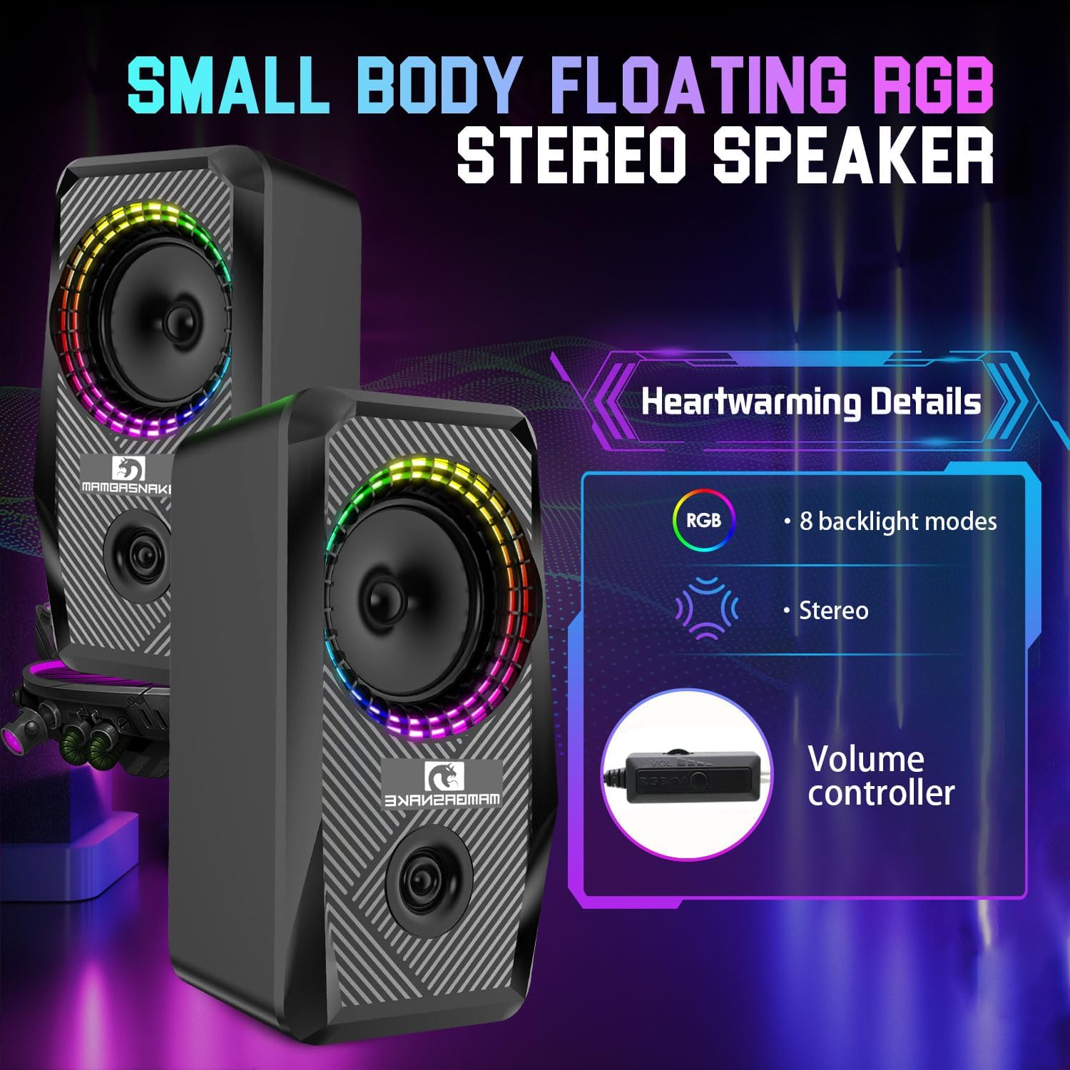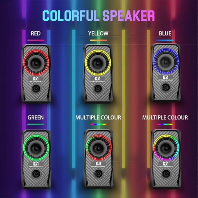 • Динамичен RGB геймърски високоговорител: Цветна RGB LED светлина, 3D стерео звук, пикова мощност 10W, отлично звуково представяне, което го прави чудесен аксесоар за игри, лаптопи, компютри, мобилни телефони и др. Контролер в линията на високоговорителите за увеличаване или намаляване на силата на звука, промяна на режима на осветление чрез включване/изключване на светлината, осигуряващ по-приятно изживяване при игра/гледане на филми или слушане на музика.