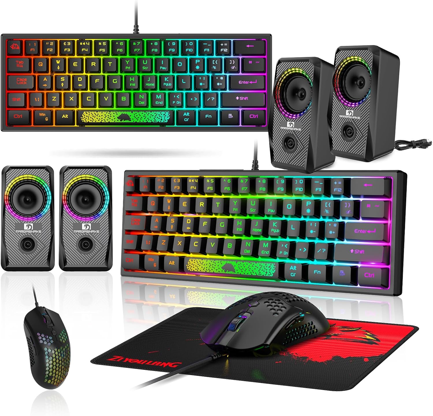 Комплект клавиатура и мишка LexonElec, аксесоари за Champing, PC пакет - 60 процента ултра компактна светеща мини клавиатура с QWERTY оформление и 6400 DPI мишка, бас високоговорител, дишаща подложка за мишка