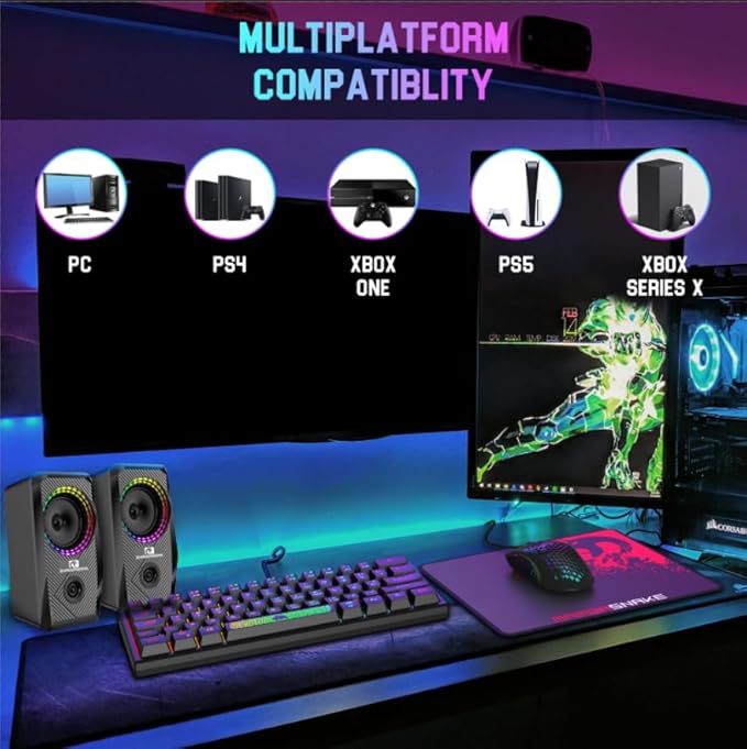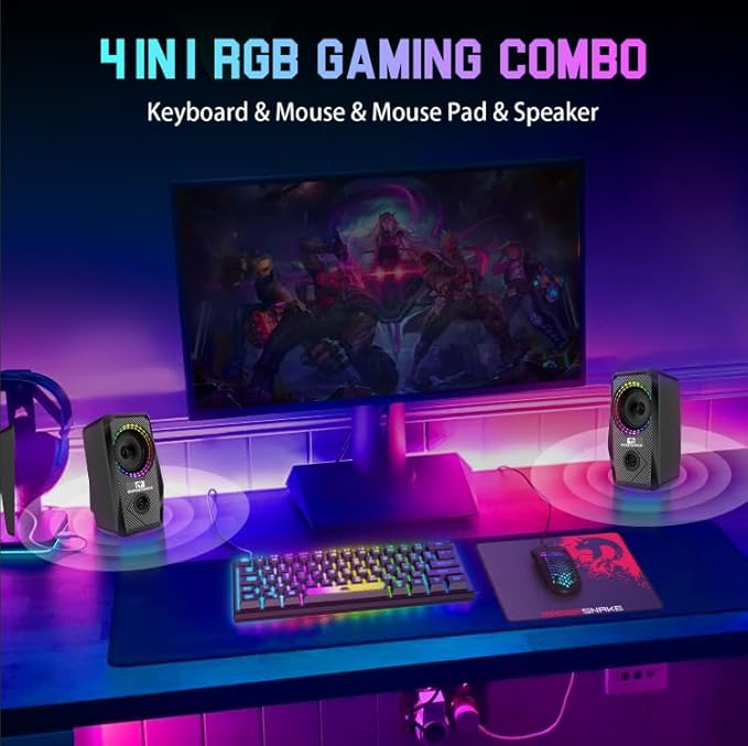 • ???? 4 в 1 мини RGB геймърска комбинация Персонализируема RGB клавиатура с британска подсветка + цветна 3200 DPI RGB мишка + динамичен RGB стерео високоговорител + линейна RGB подложка за мишка ви осигуряват по-добро визуално RGB изживяване, когато играете игри.